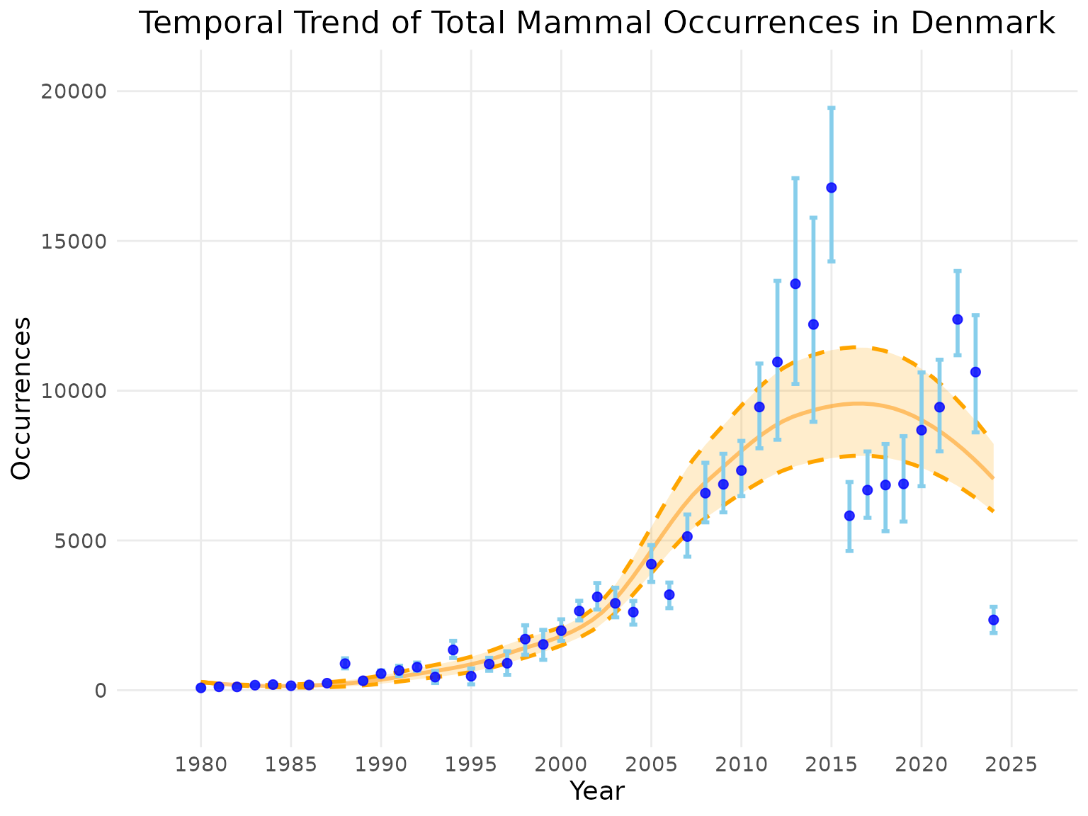 title = "Temporal Trend of Total Mammal Occurrences in Denmark",