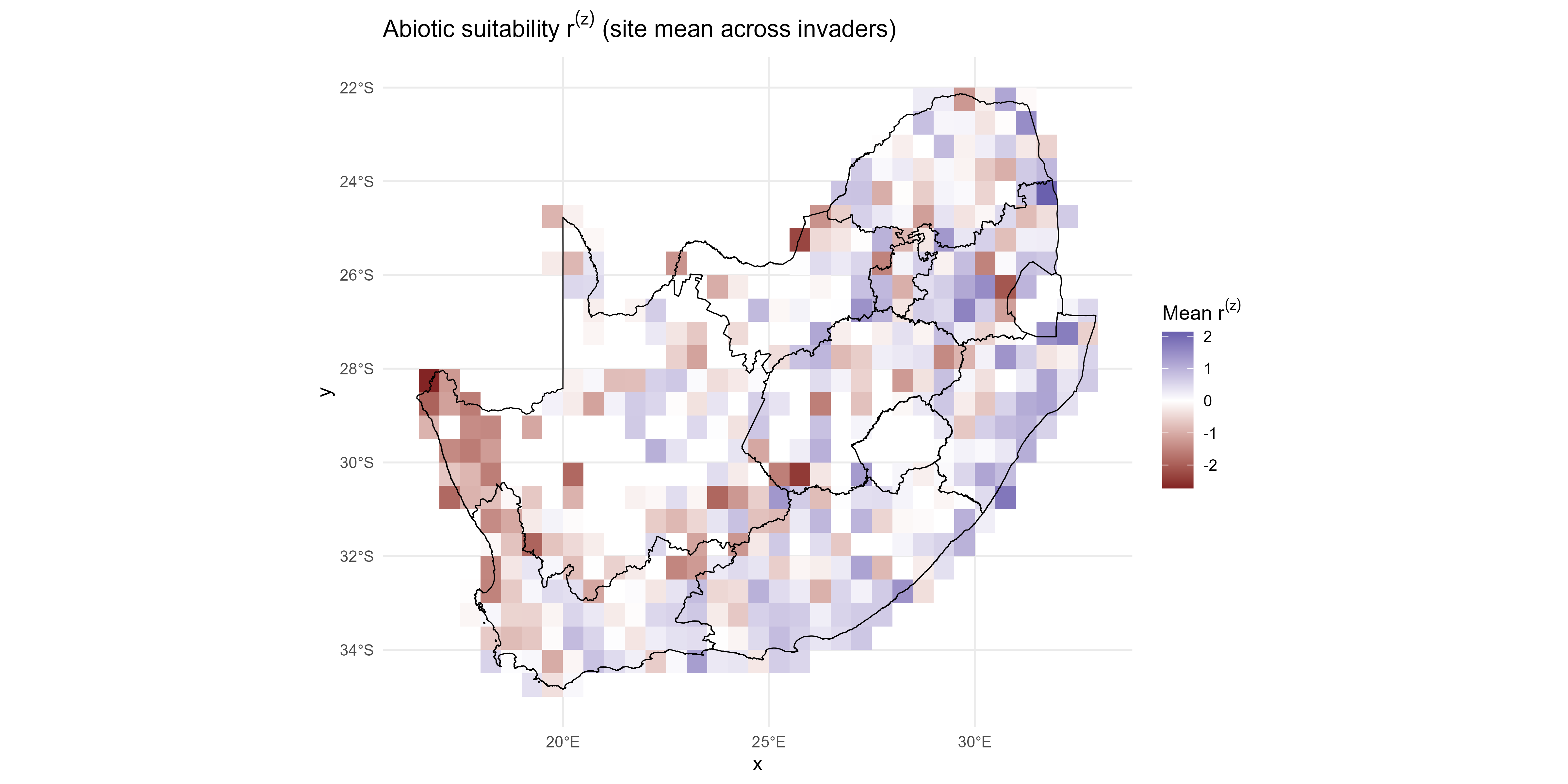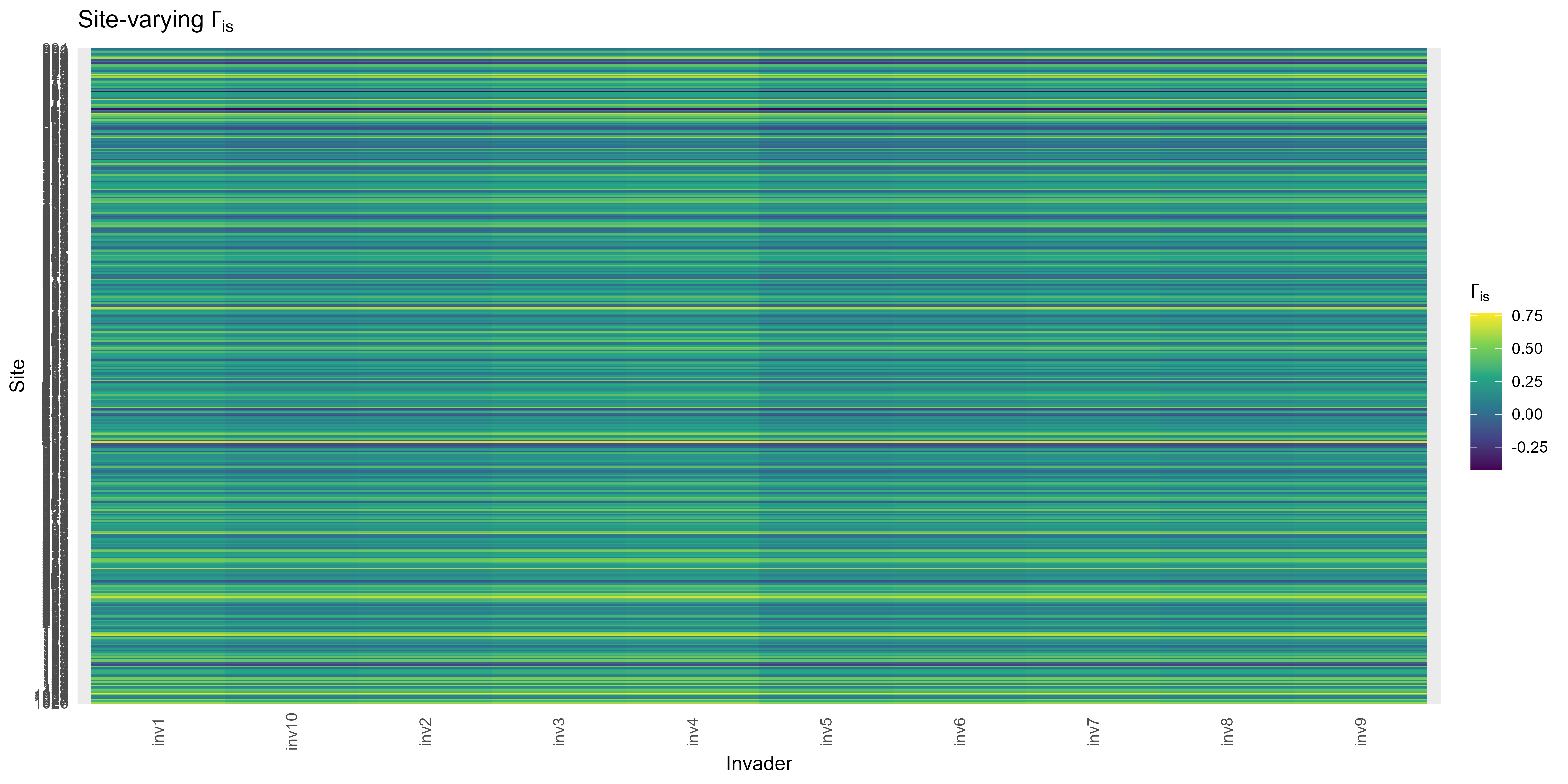 - where \(r^{(z)}_{is}\) is the invader’s environmental fit at the site (standardised so values are comparable across sites and species). ➜ The coefficient \(\Gamma_{is}\) tells how strongly that fit translates into potential growth.