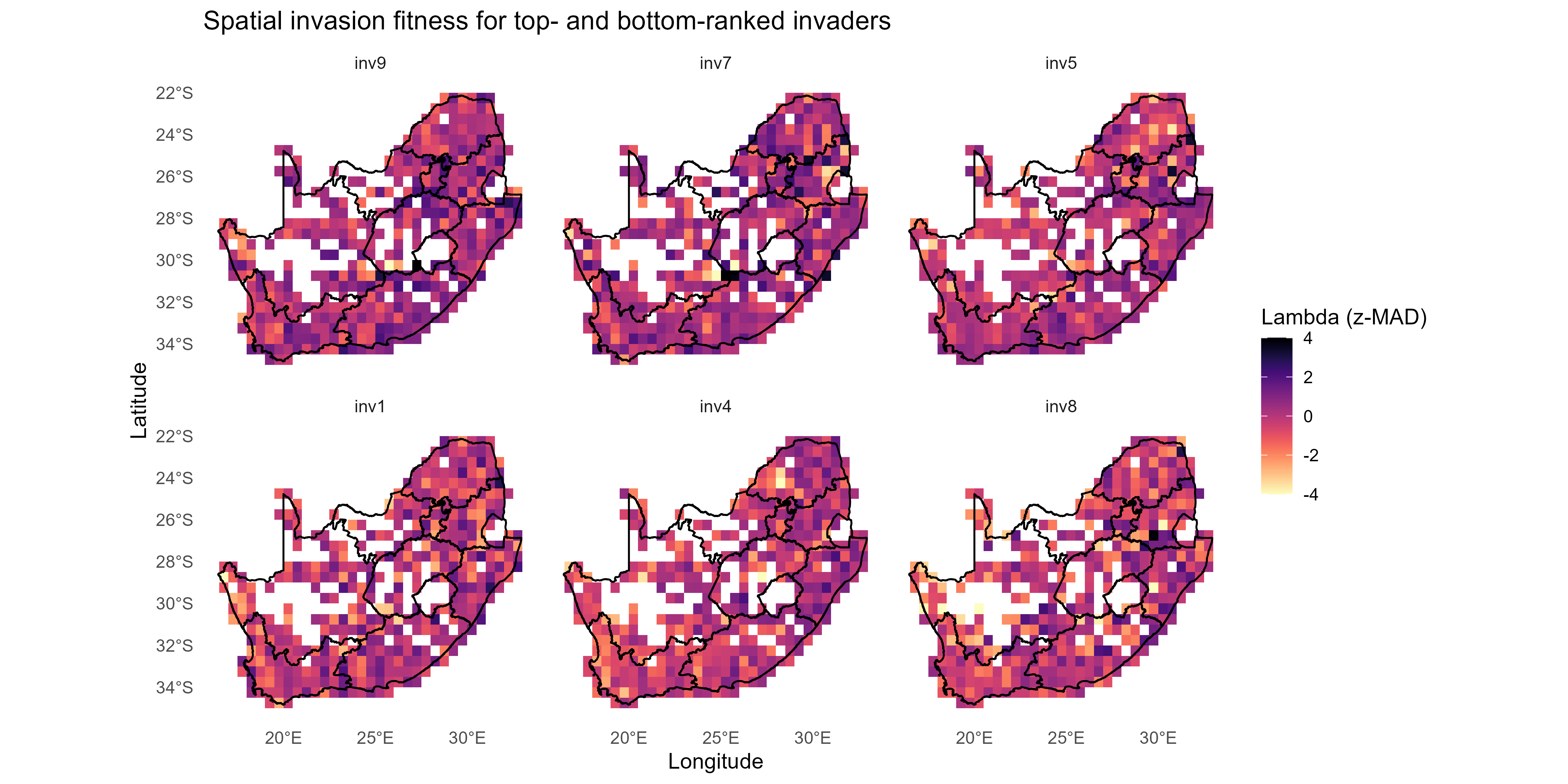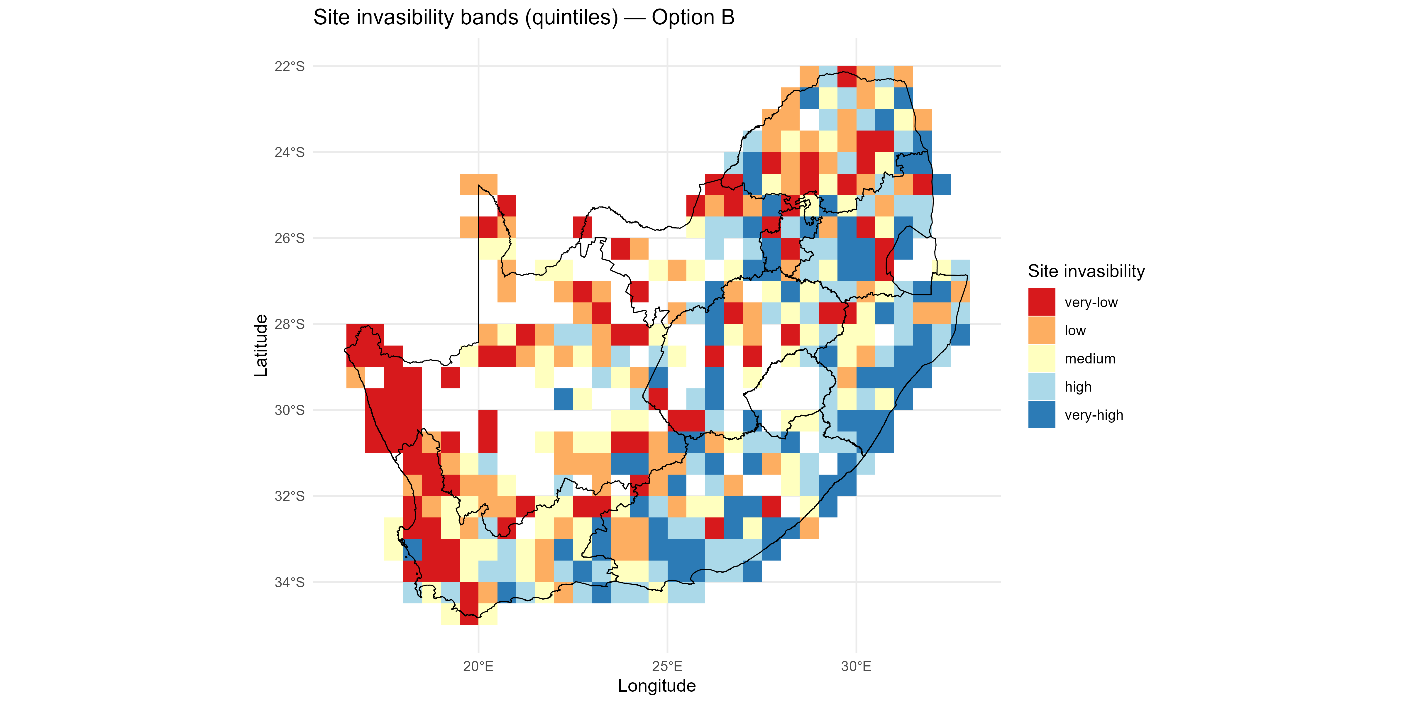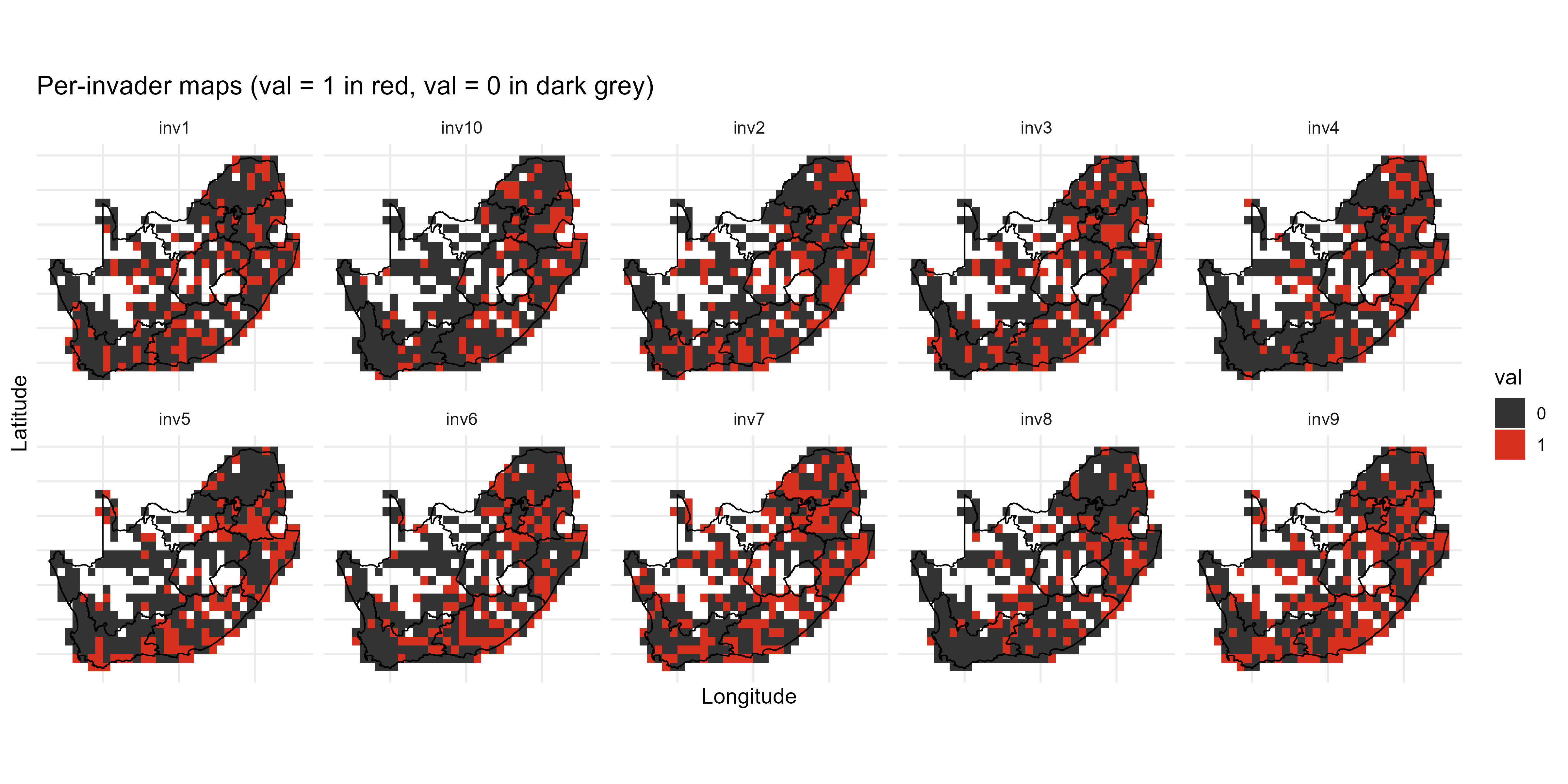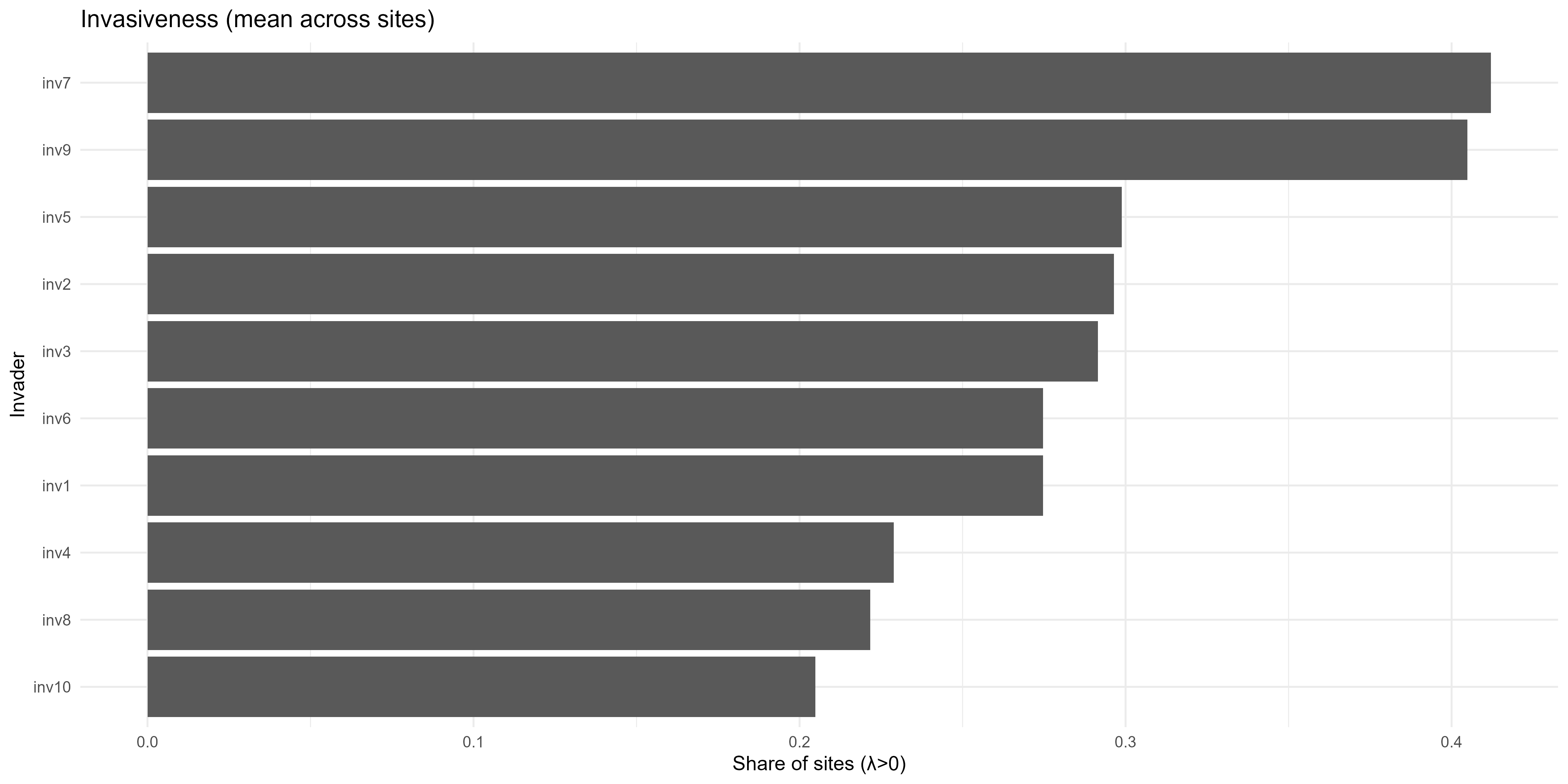 The invasion fitness output can be aggregated to site and species level summaries of invasiveness \(V_i\) & \(T_{ik}\) and invasibility \(V_s\) to provide interpretable metrics for mapping and prioritisation;