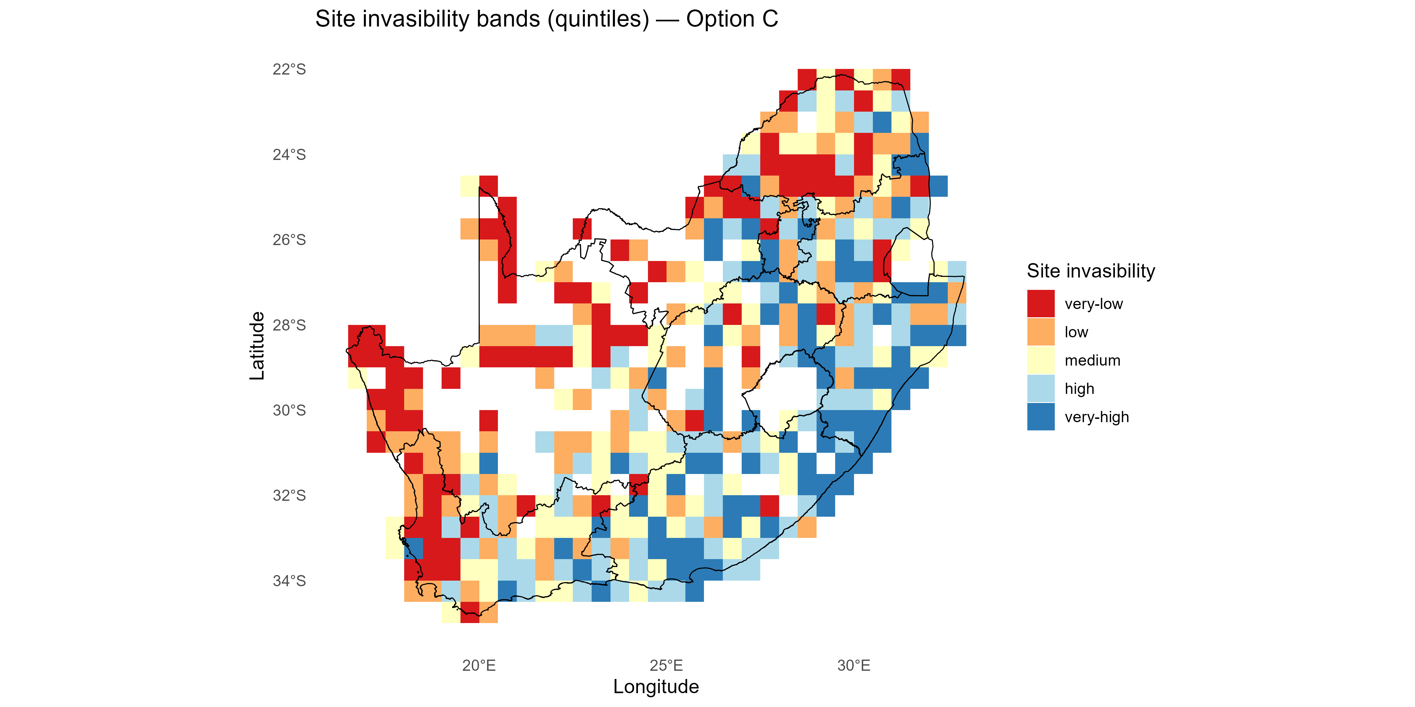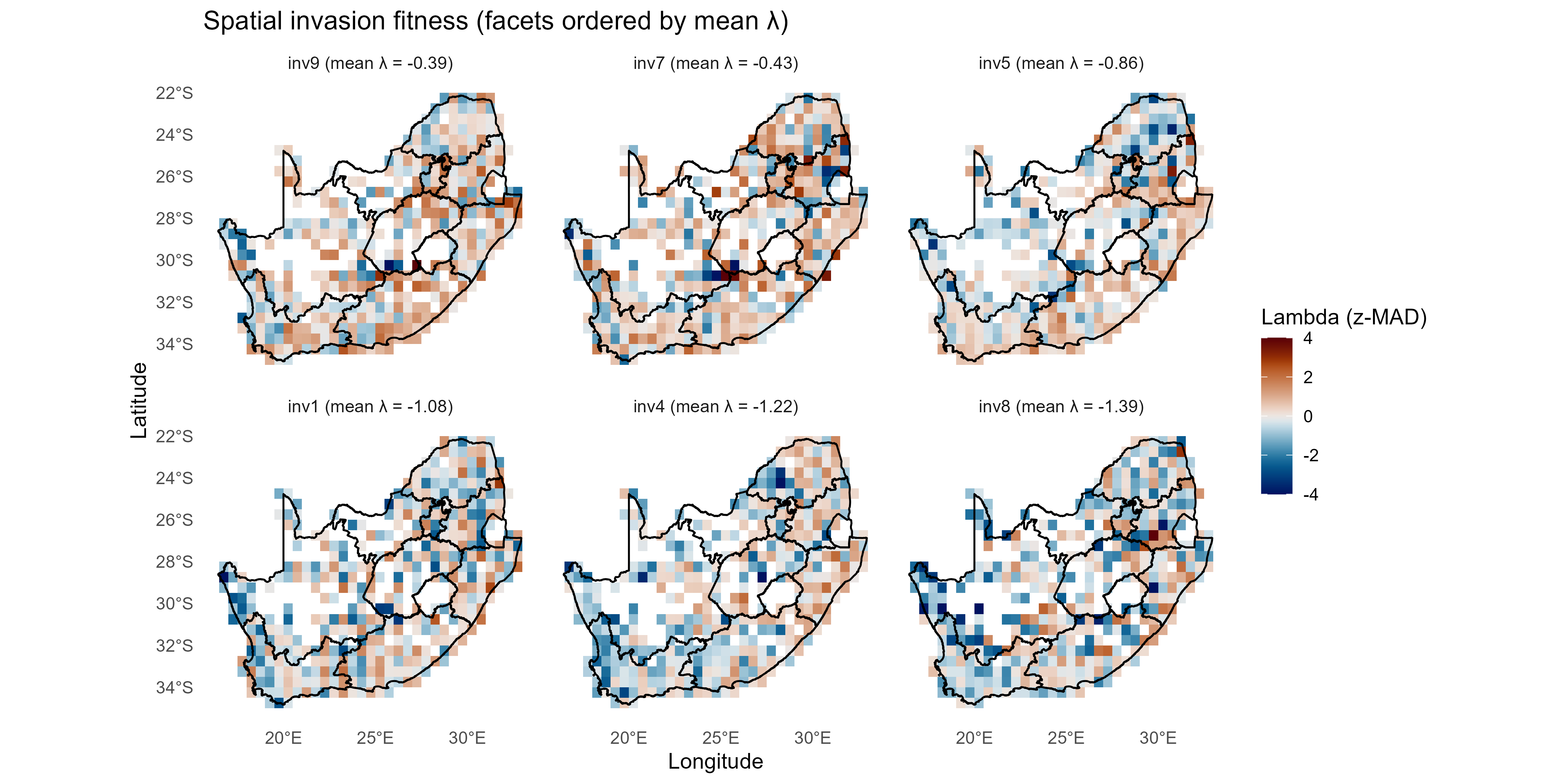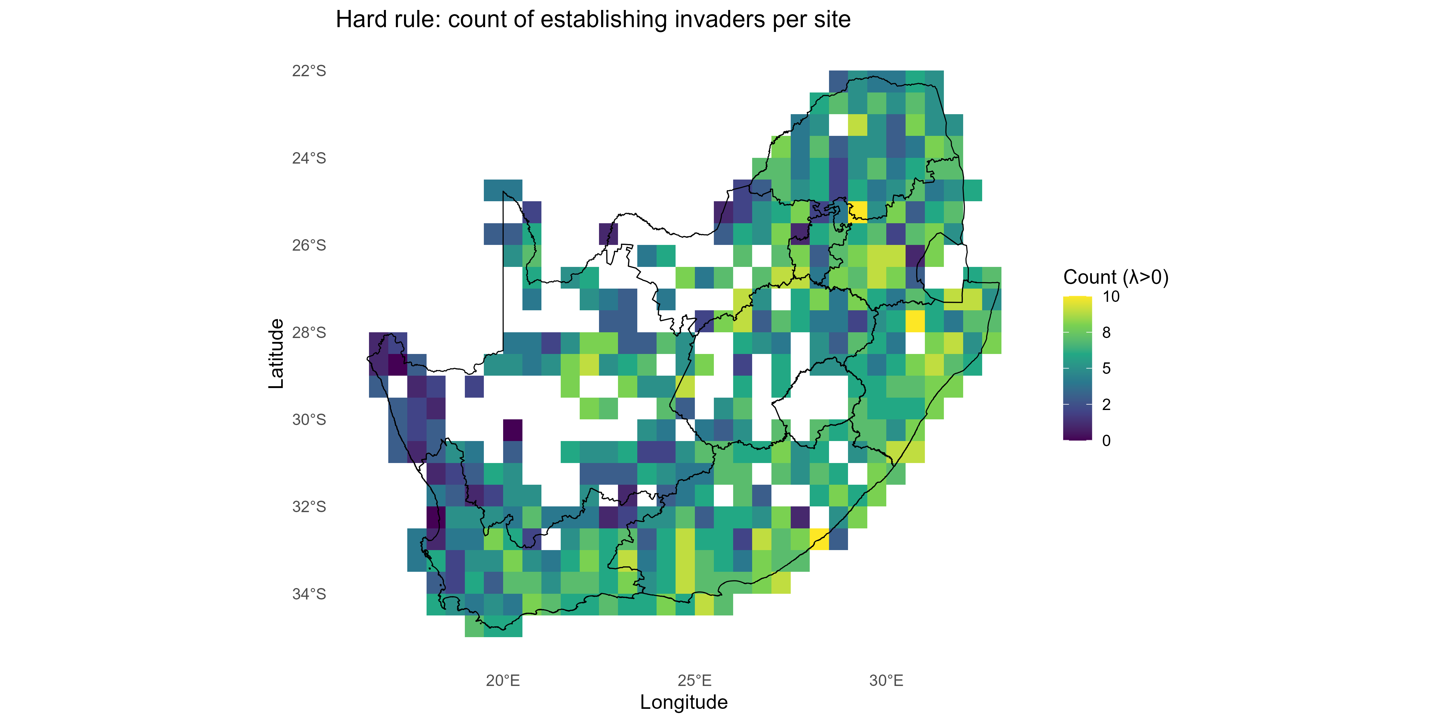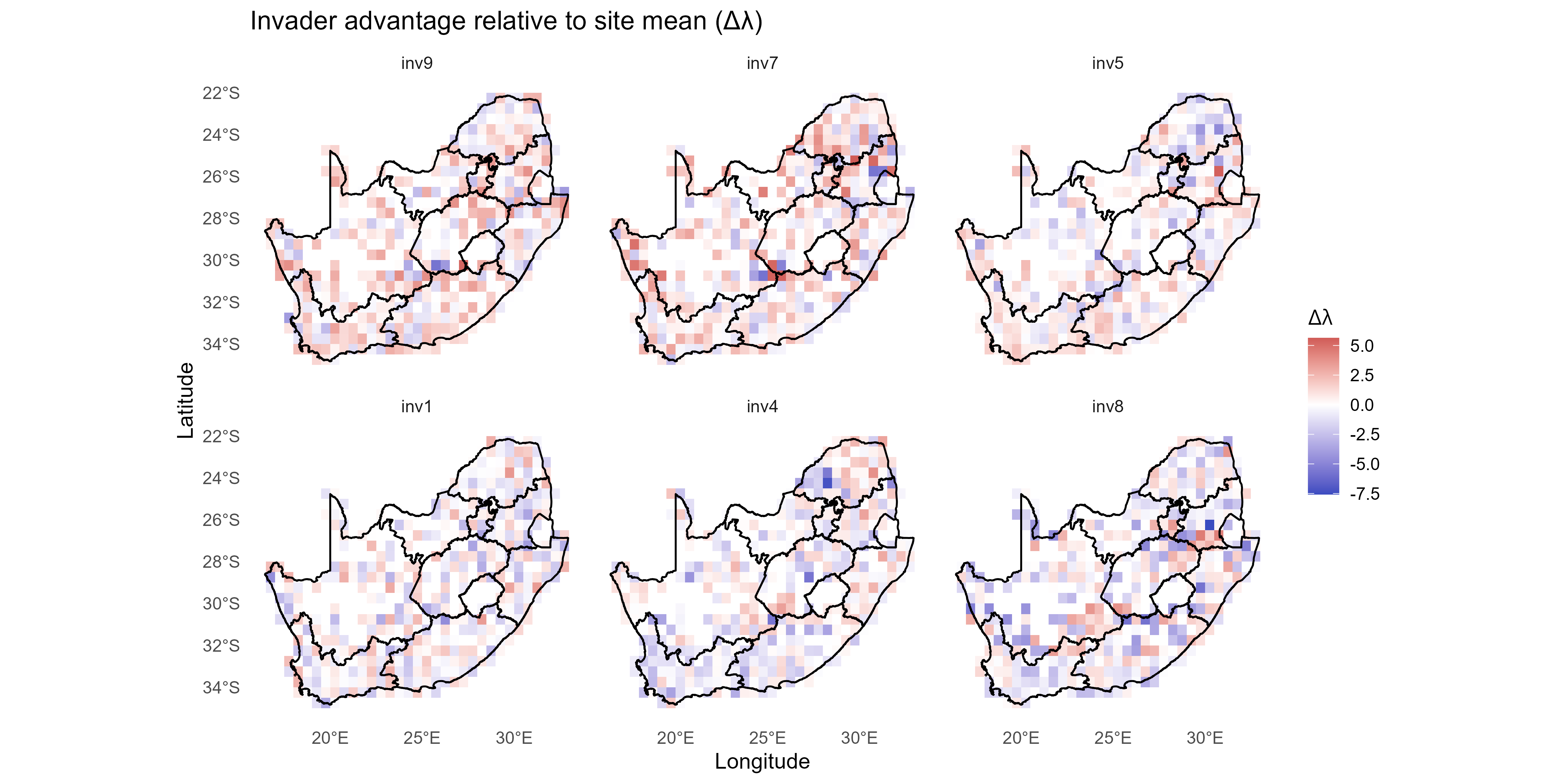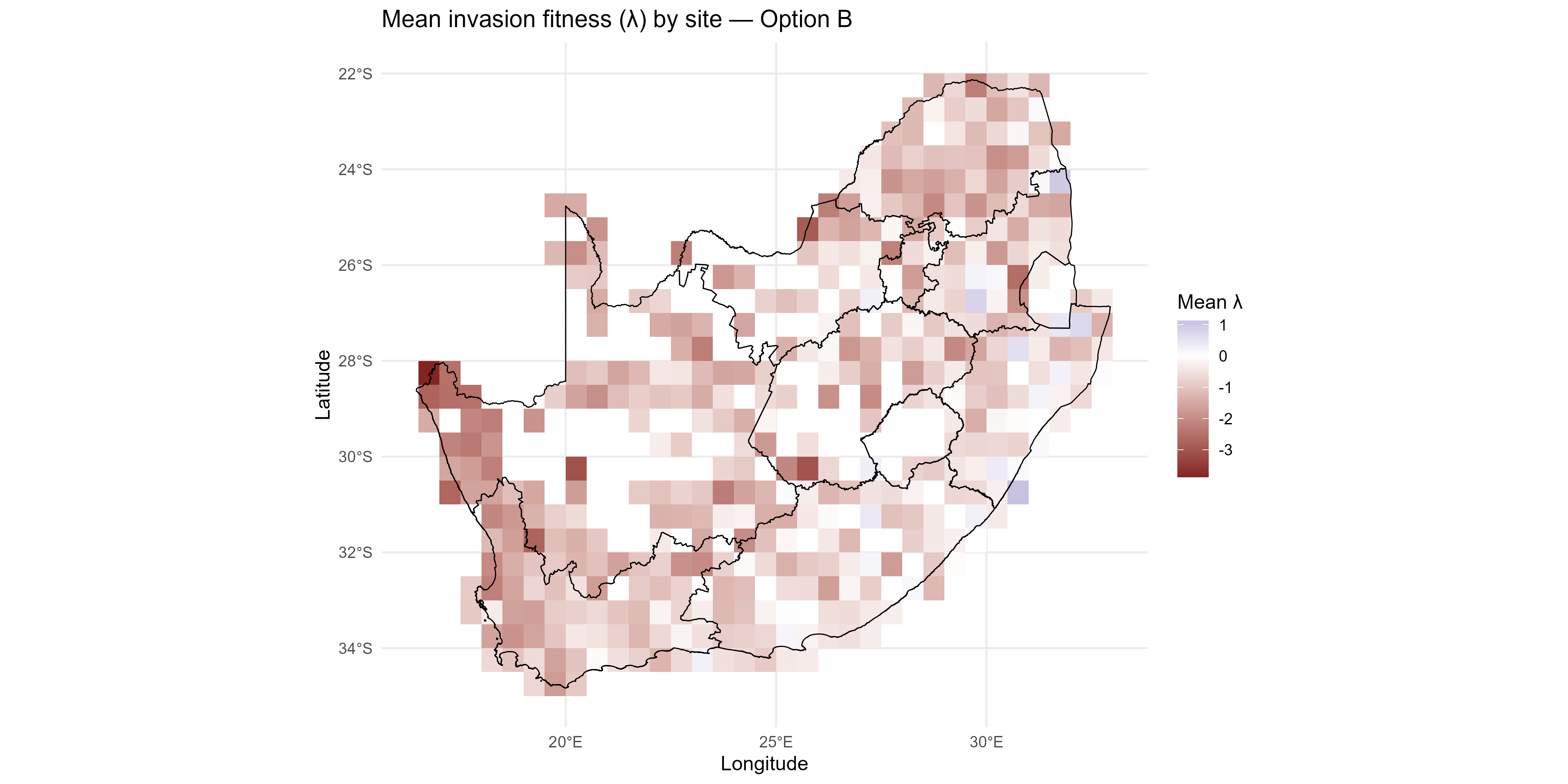 The invasion fitness output can be aggregated to site and species level summaries of invasiveness \(V_i\) & \(T_{ik}\) and invasibility \(V_s\) to provide interpretable metrics for mapping and prioritisation;
