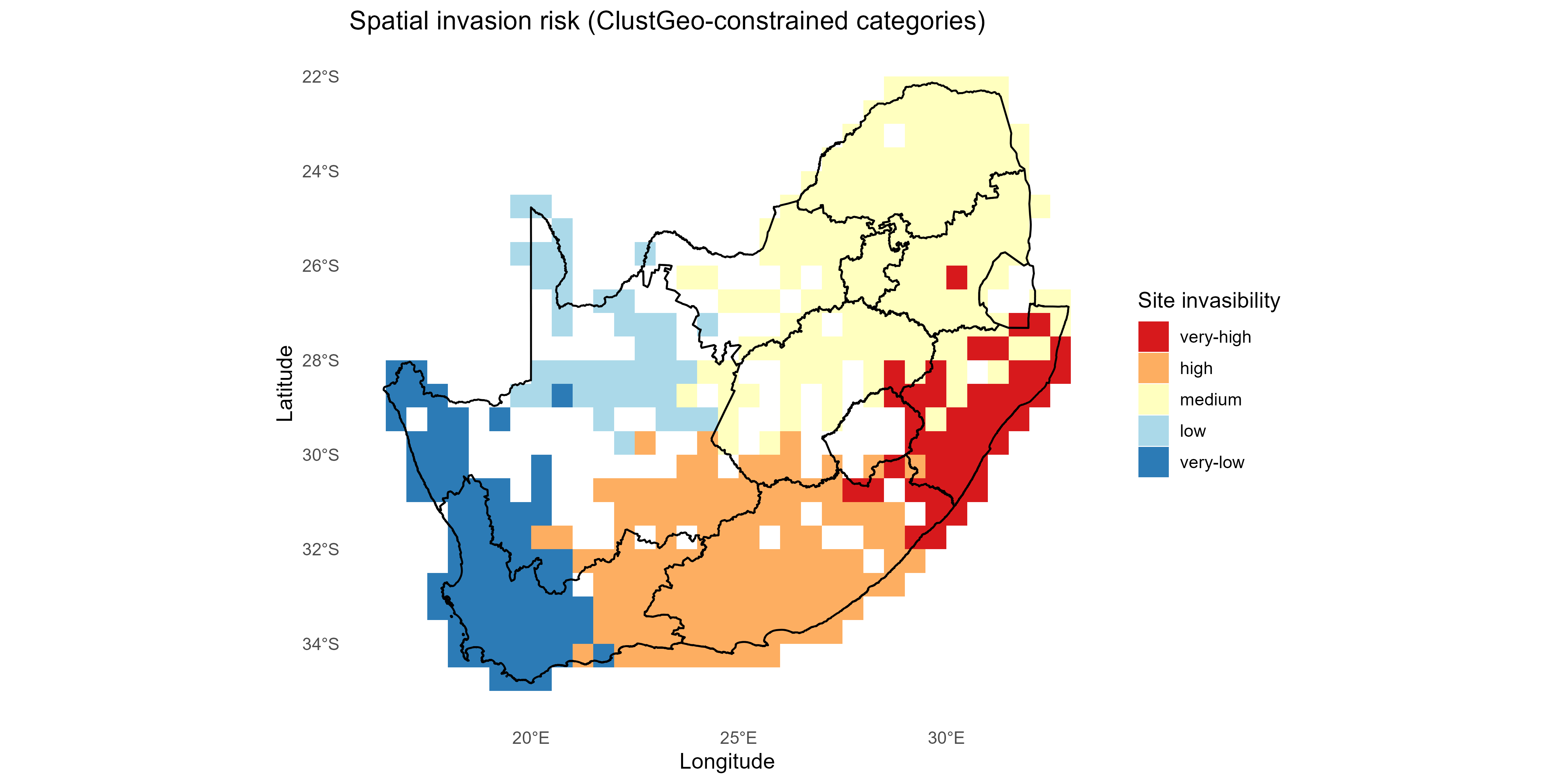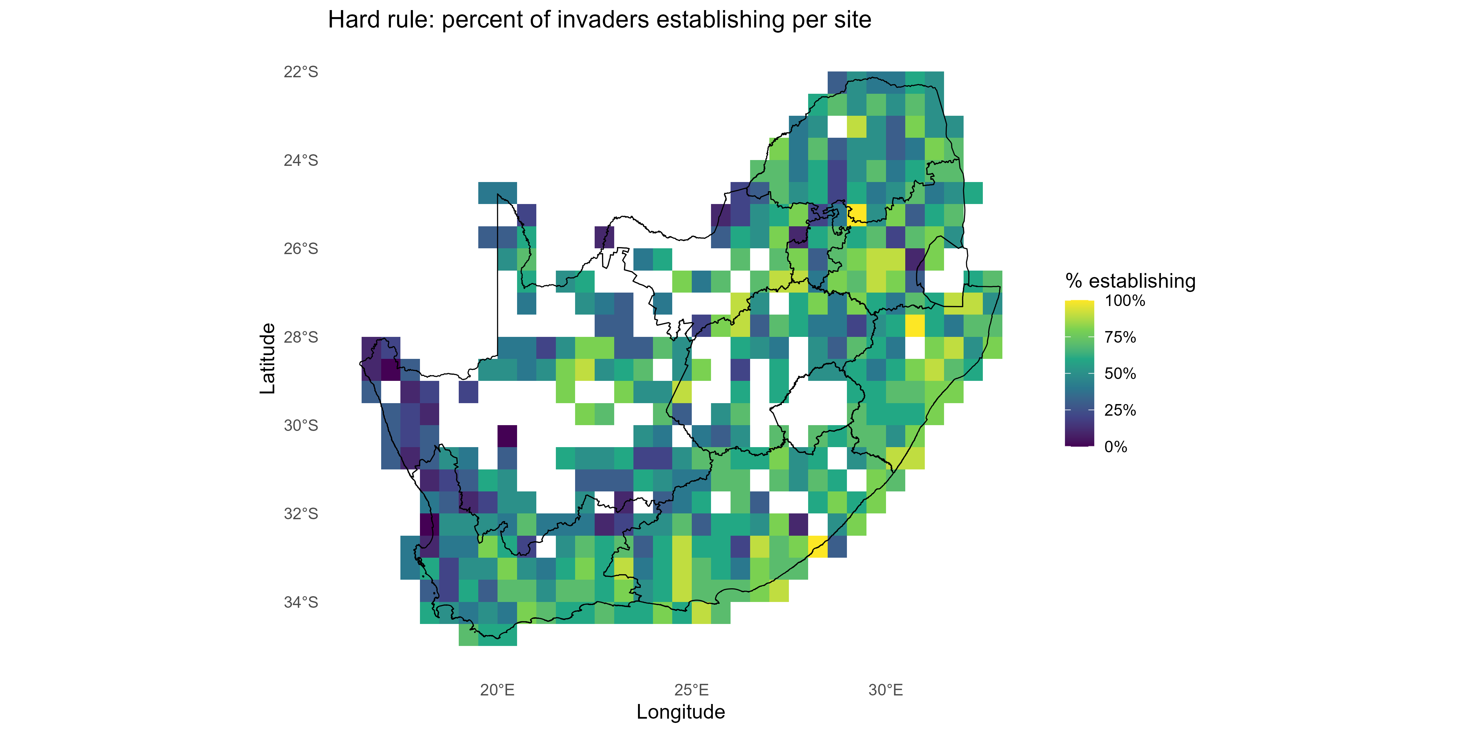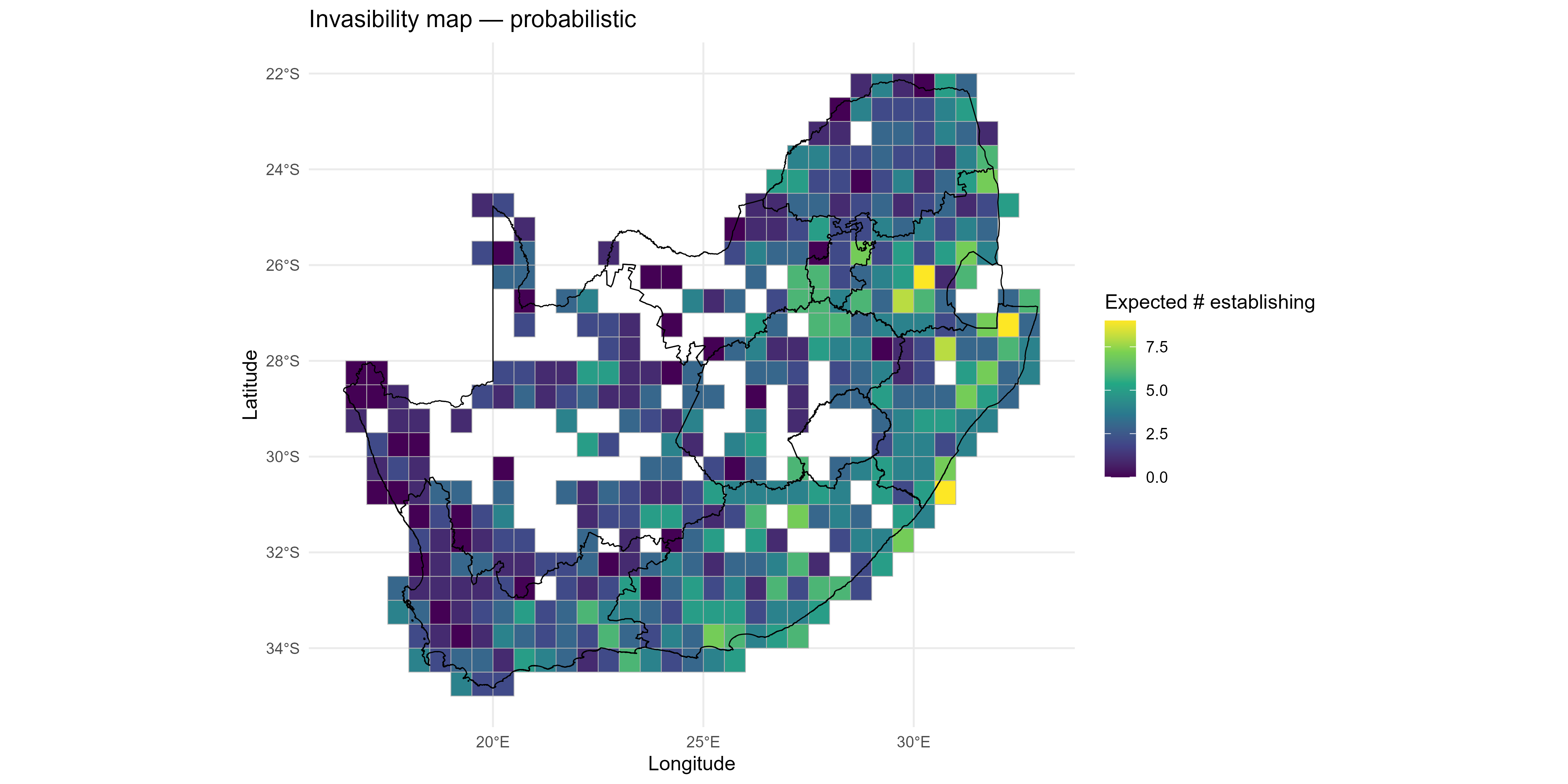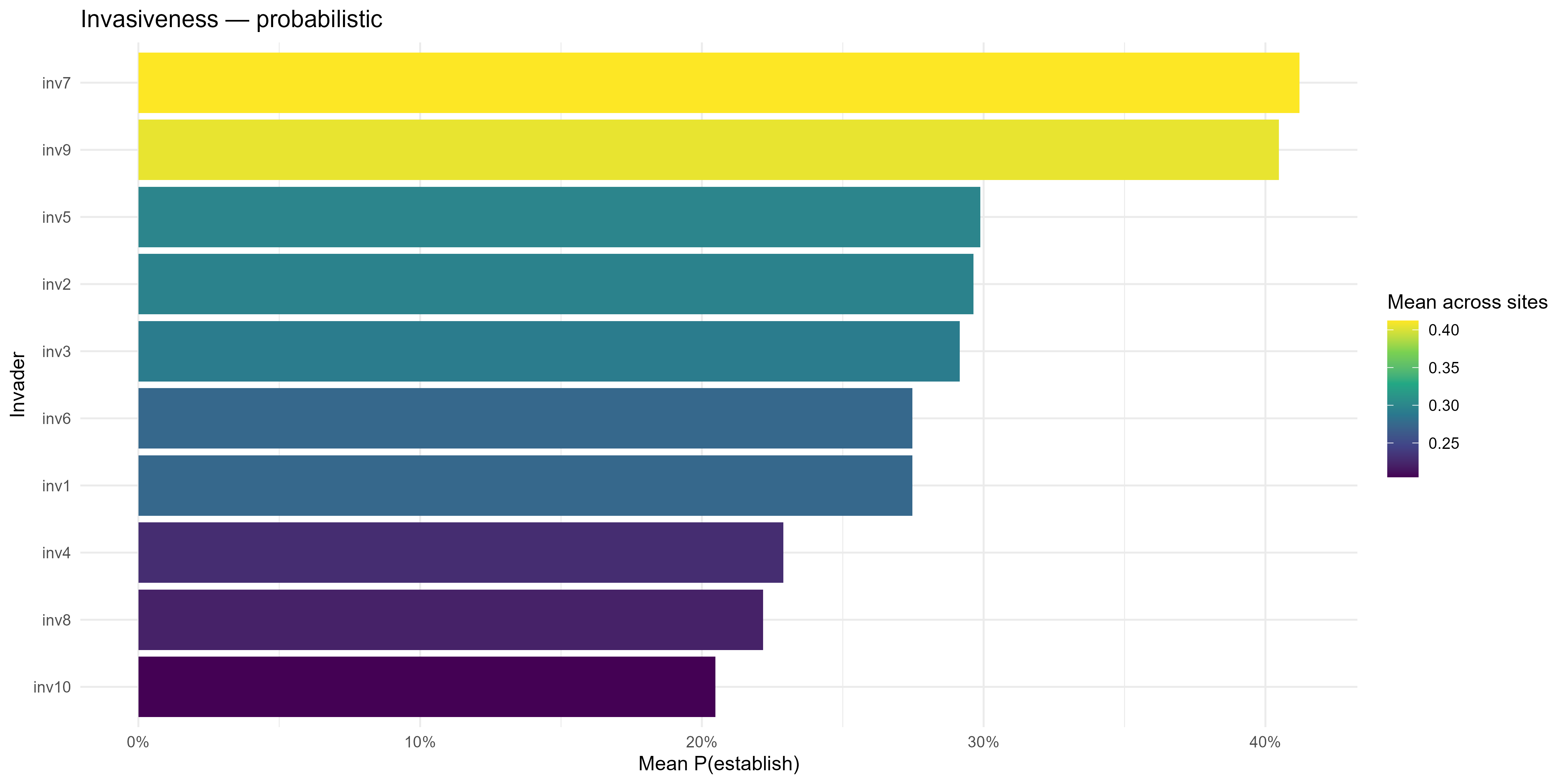 summarise_resultscallssummarise_invasiveness_invasibility()to collapse site × invader surfaces into species invasiveness (mean breadth of establishment across sites), site invasibility (mean probability or fraction of invaders establishing), and trait-level associations (continuous slopes or ANOVA \(R^2\) for categorical traits). Outputs include tidy species- and site-level tables, trait-effect summaries, and a suite of plots (e.g. maps, rankings, heatmaps, trait-effect diagrams), providing management-ready summaries and ecological insight.