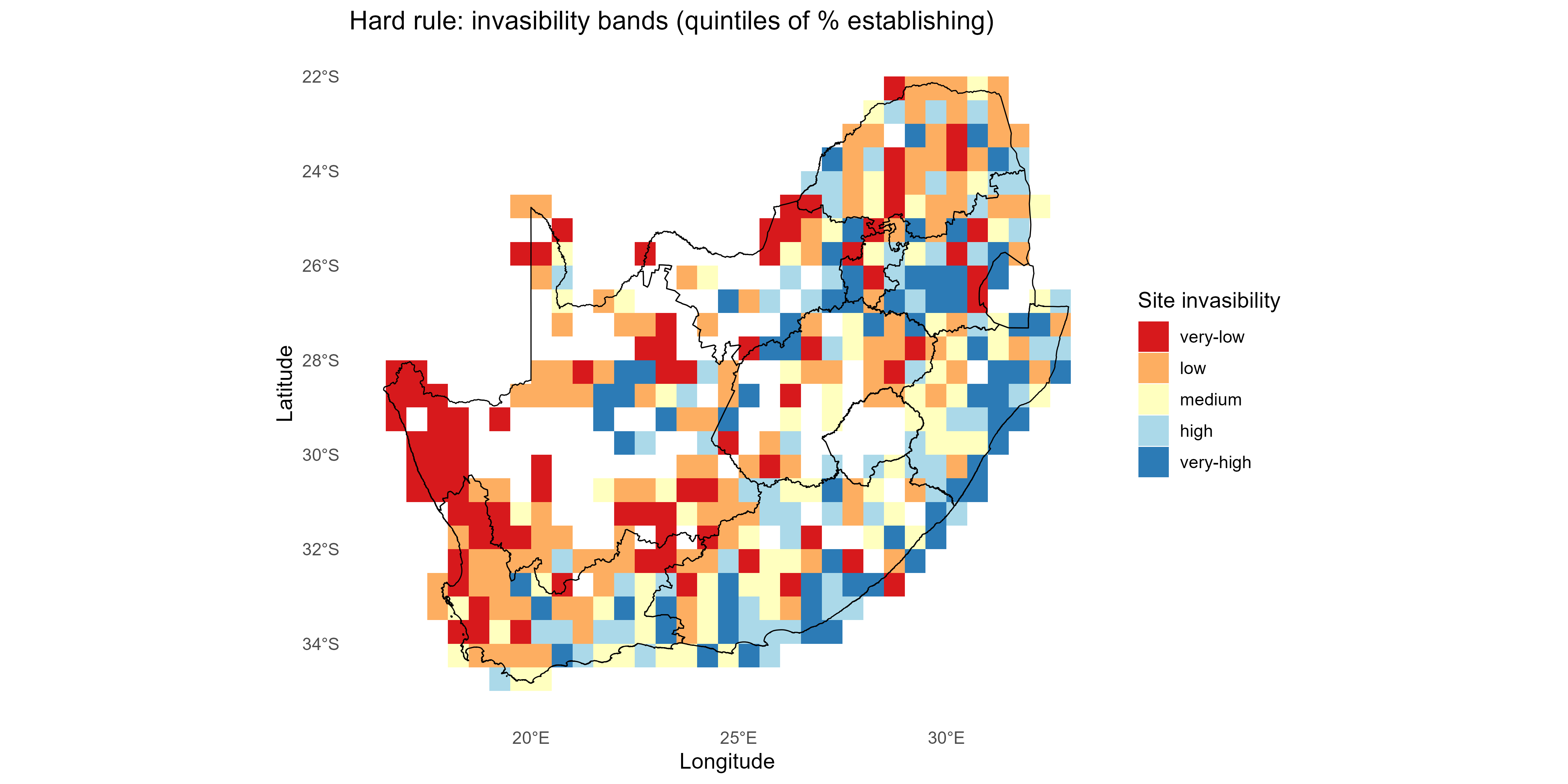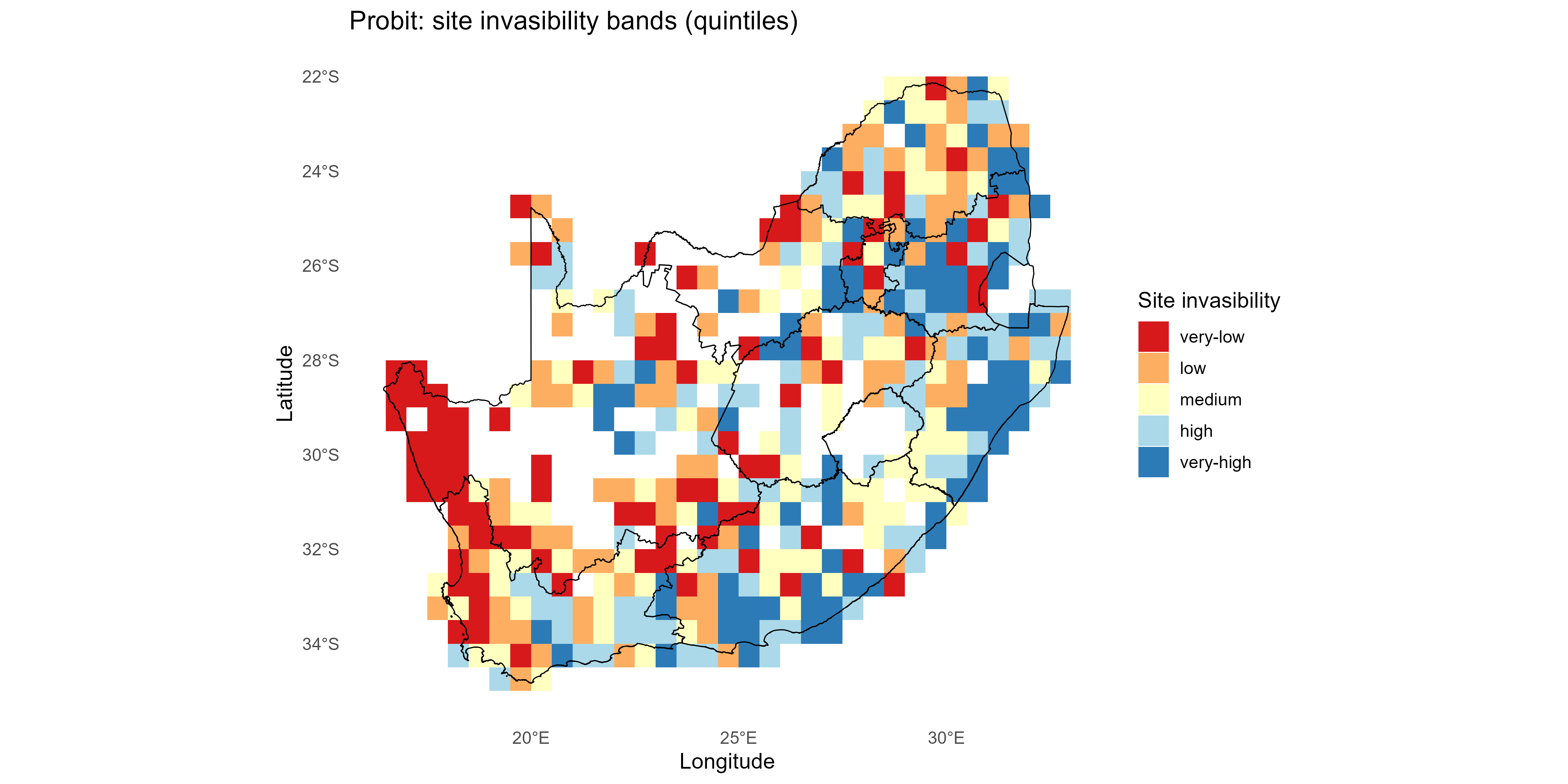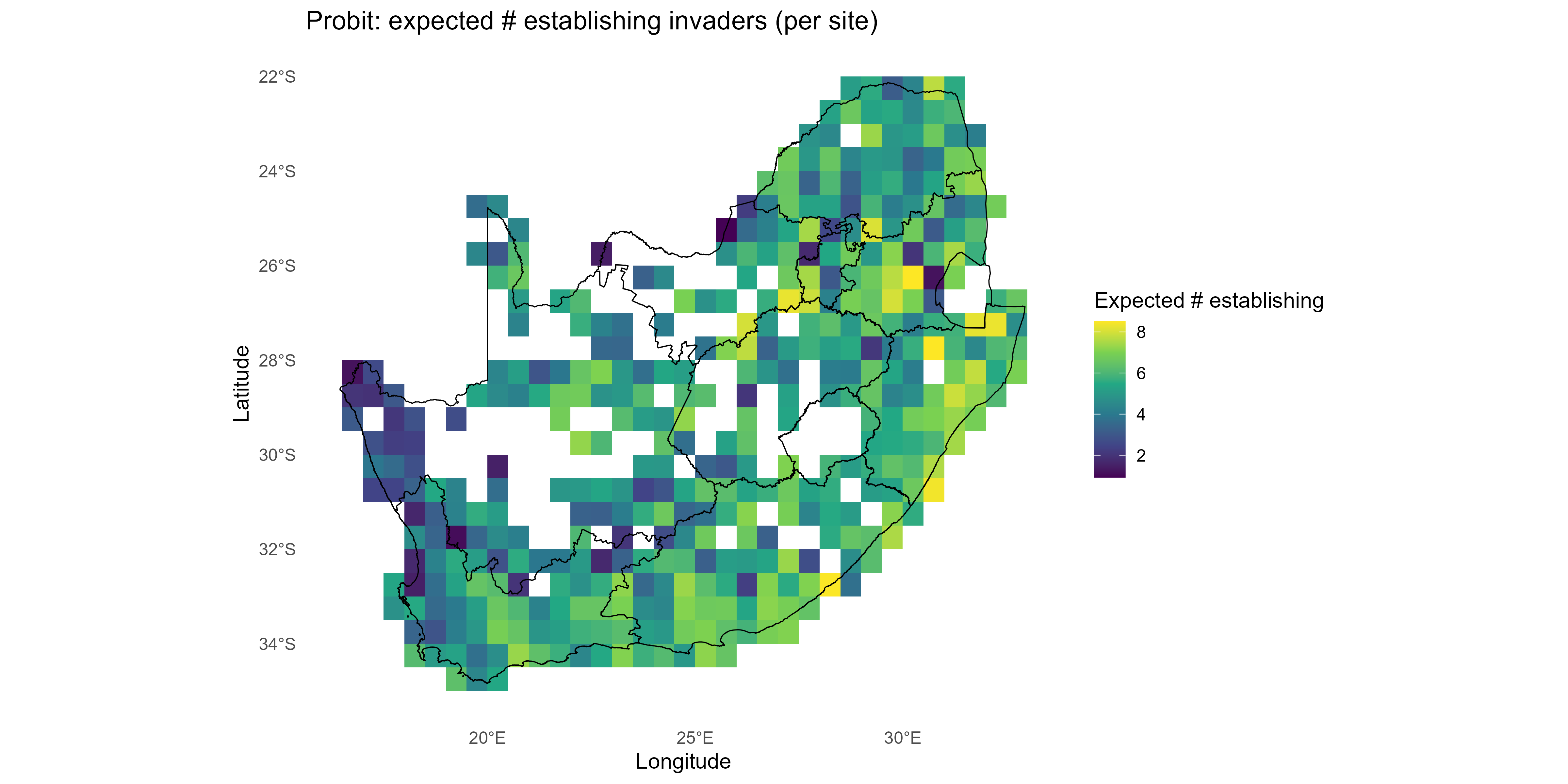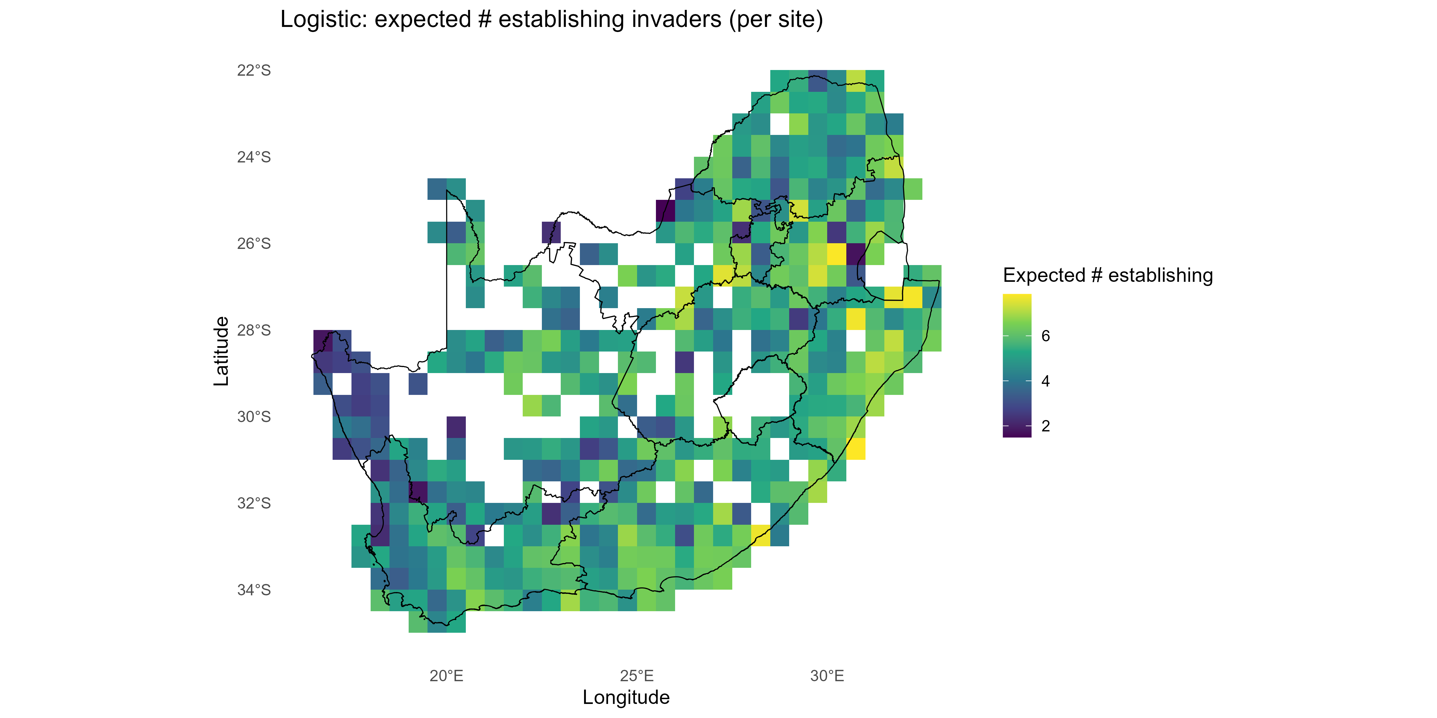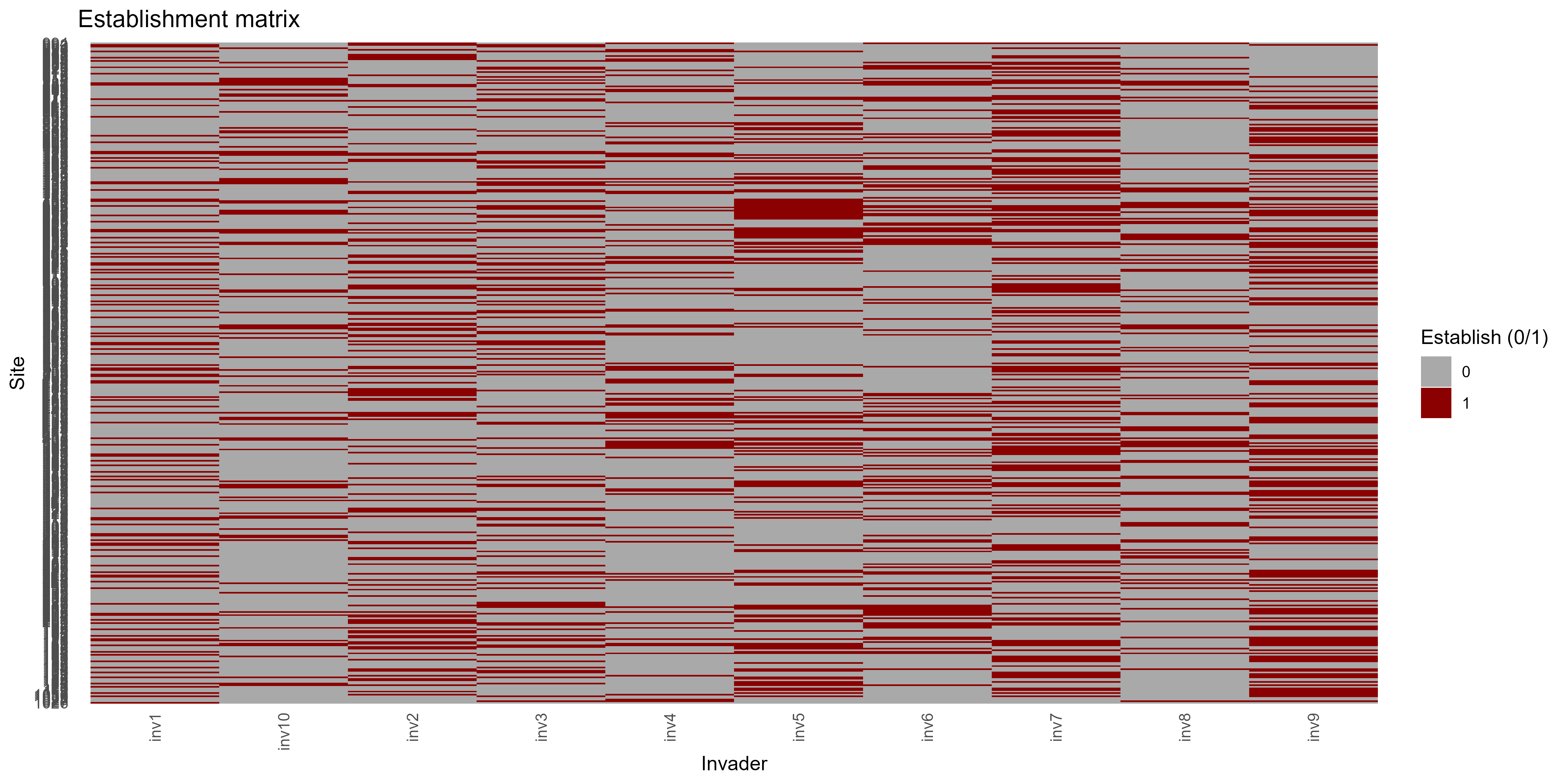Probabilistic establishment matrix (site × invader) | Used for mapping, ranking, calibration |
