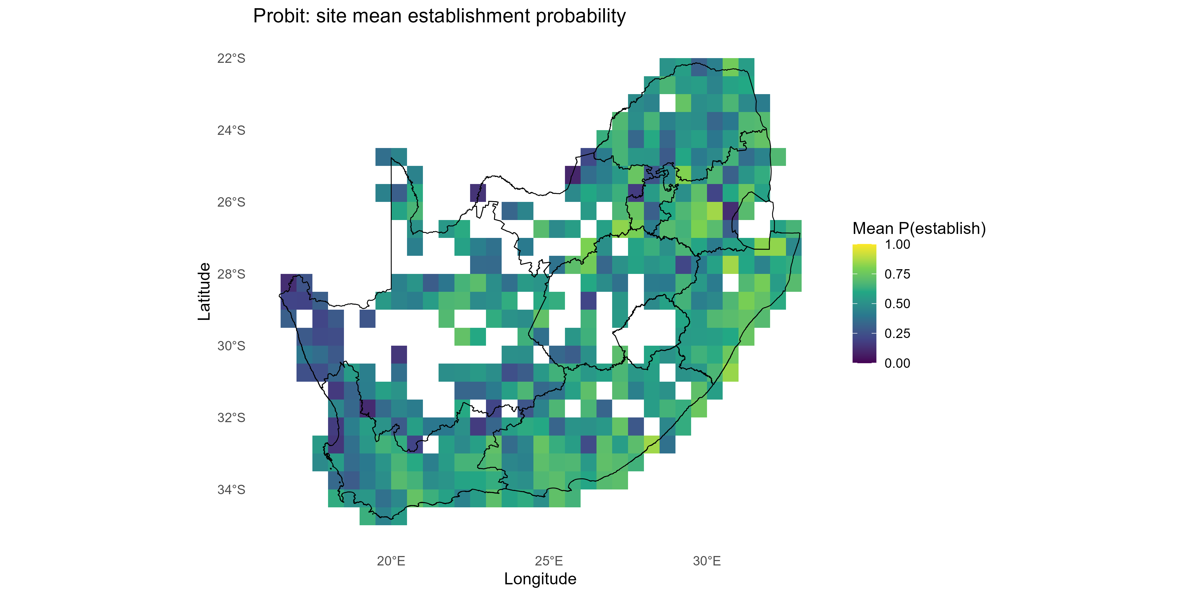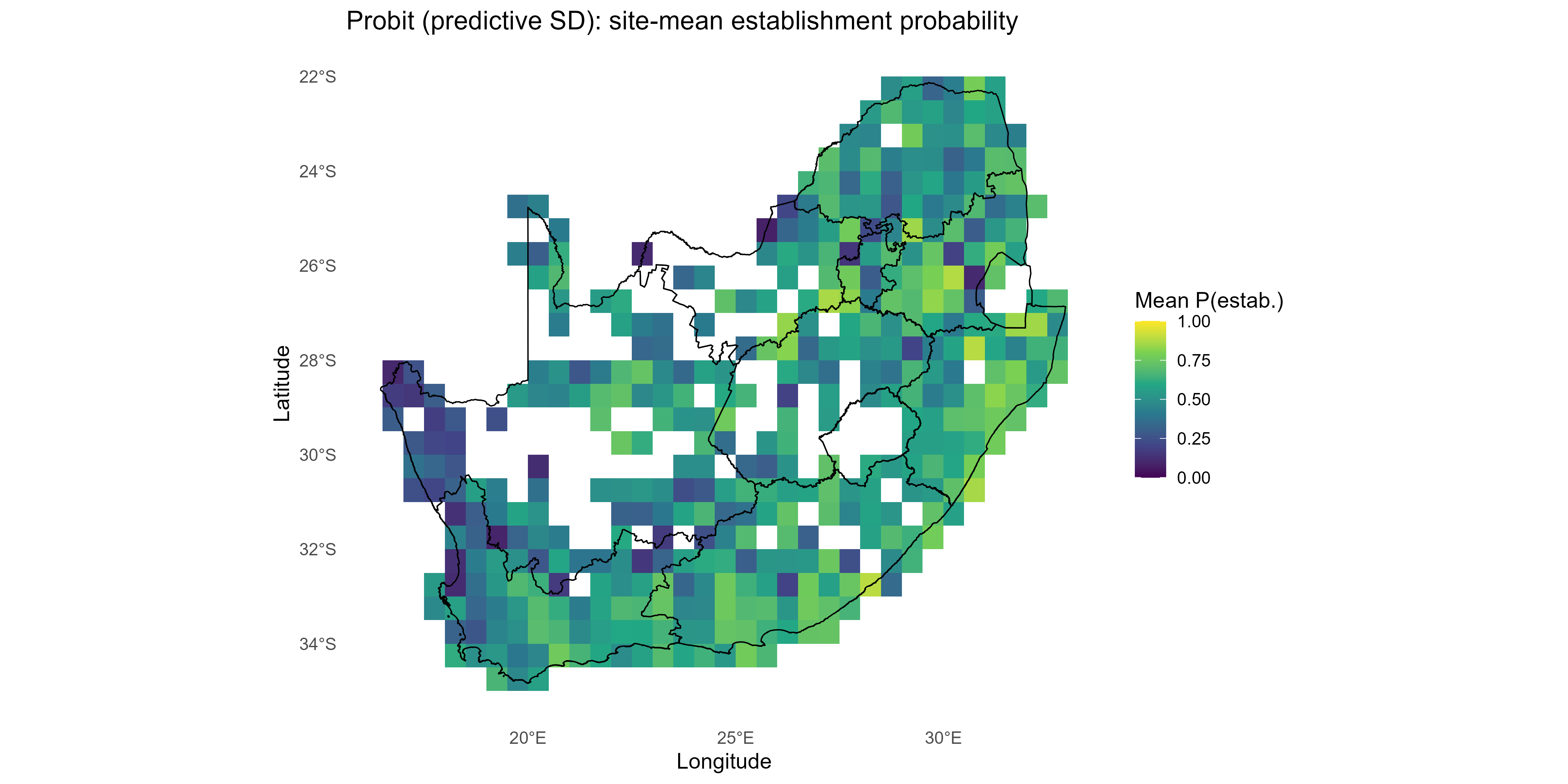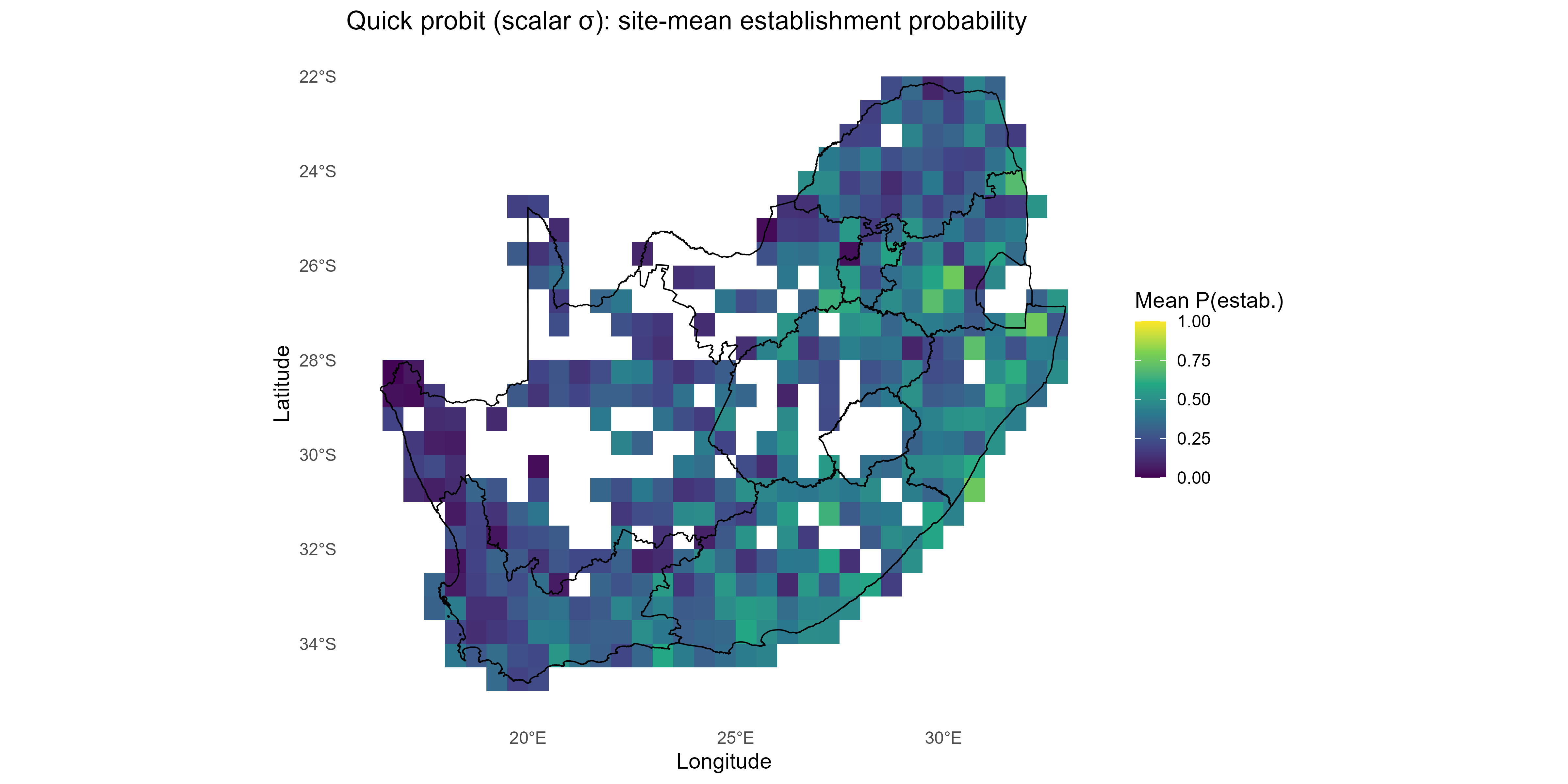 ggplot2::labs(title = "Quick probit (scalar σ): site-mean establishment probability",
