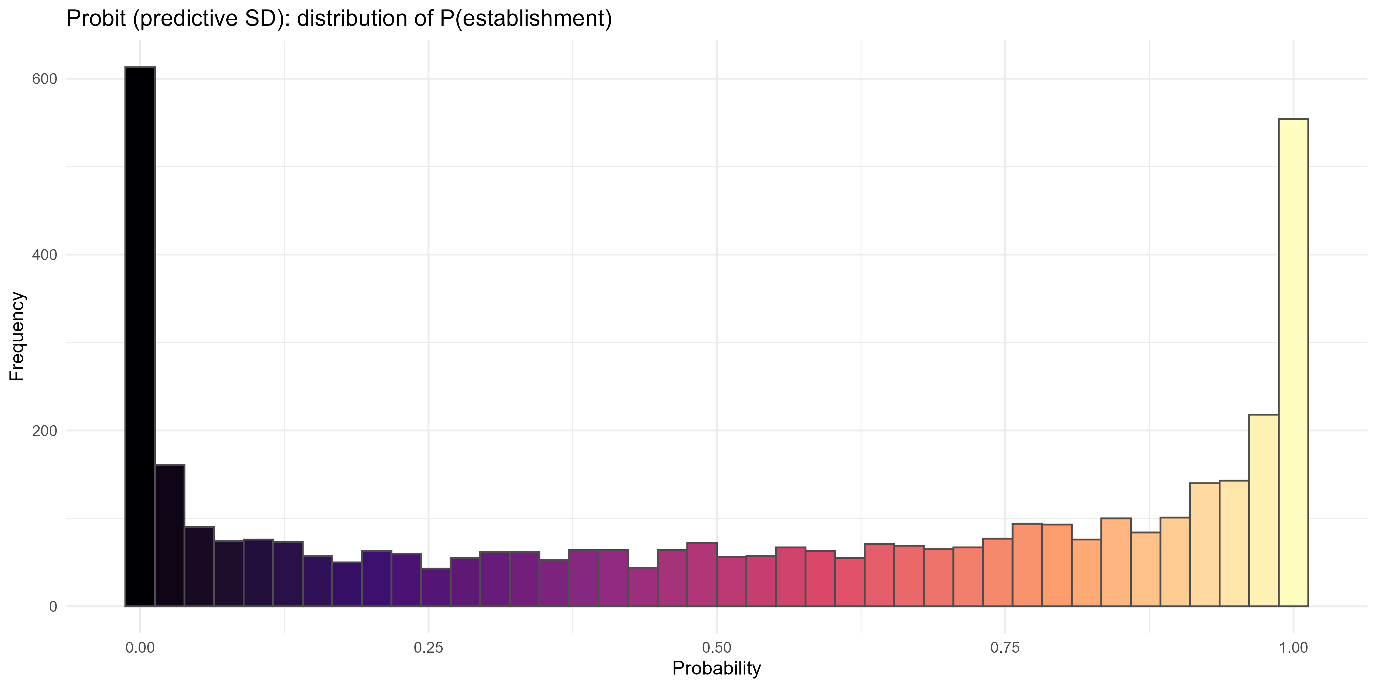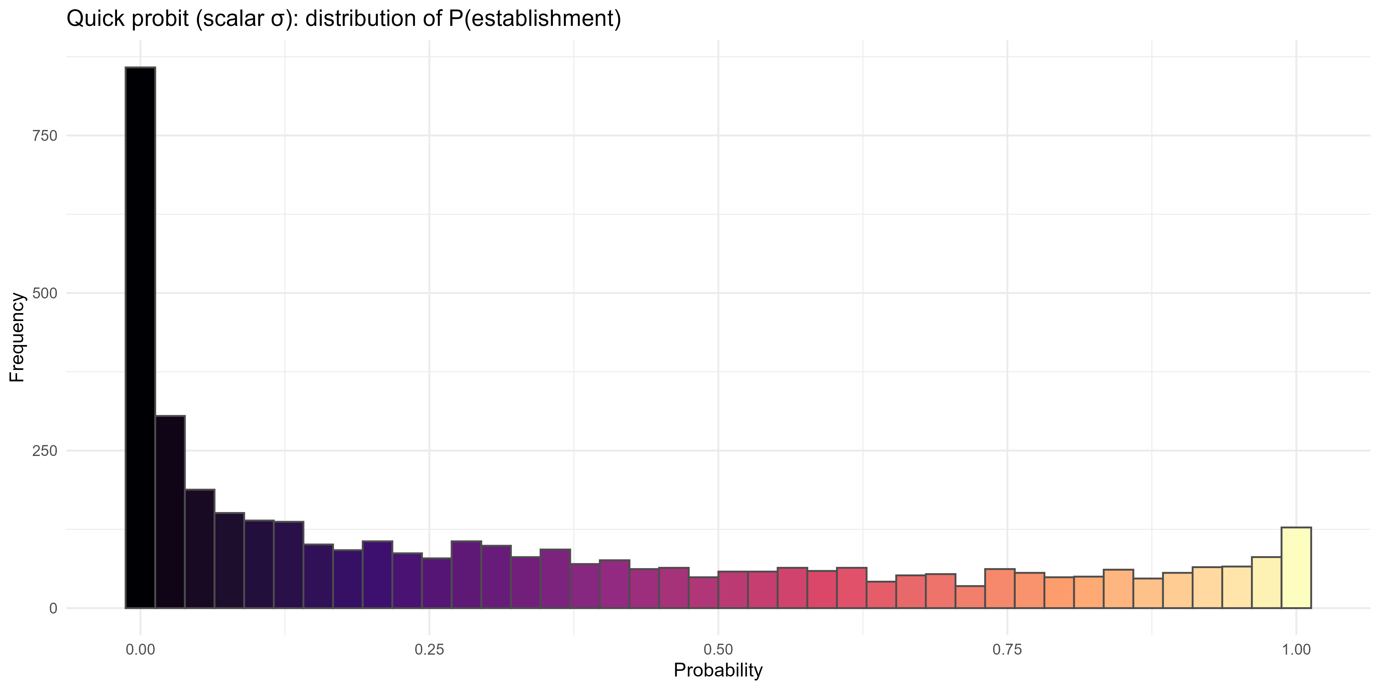 ggplot2::labs(title = "Quick probit (scalar σ): distribution of P(establishment)",
