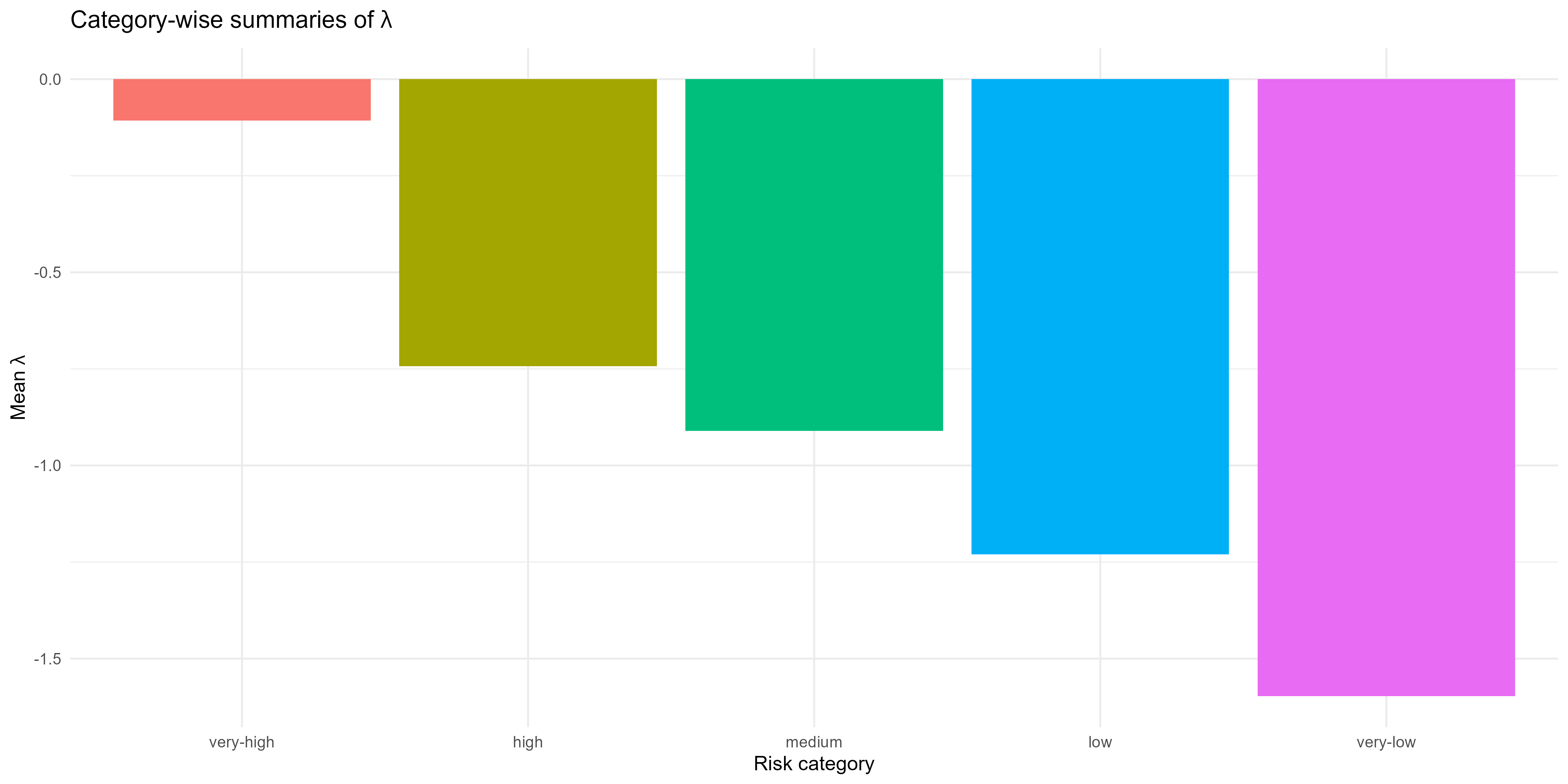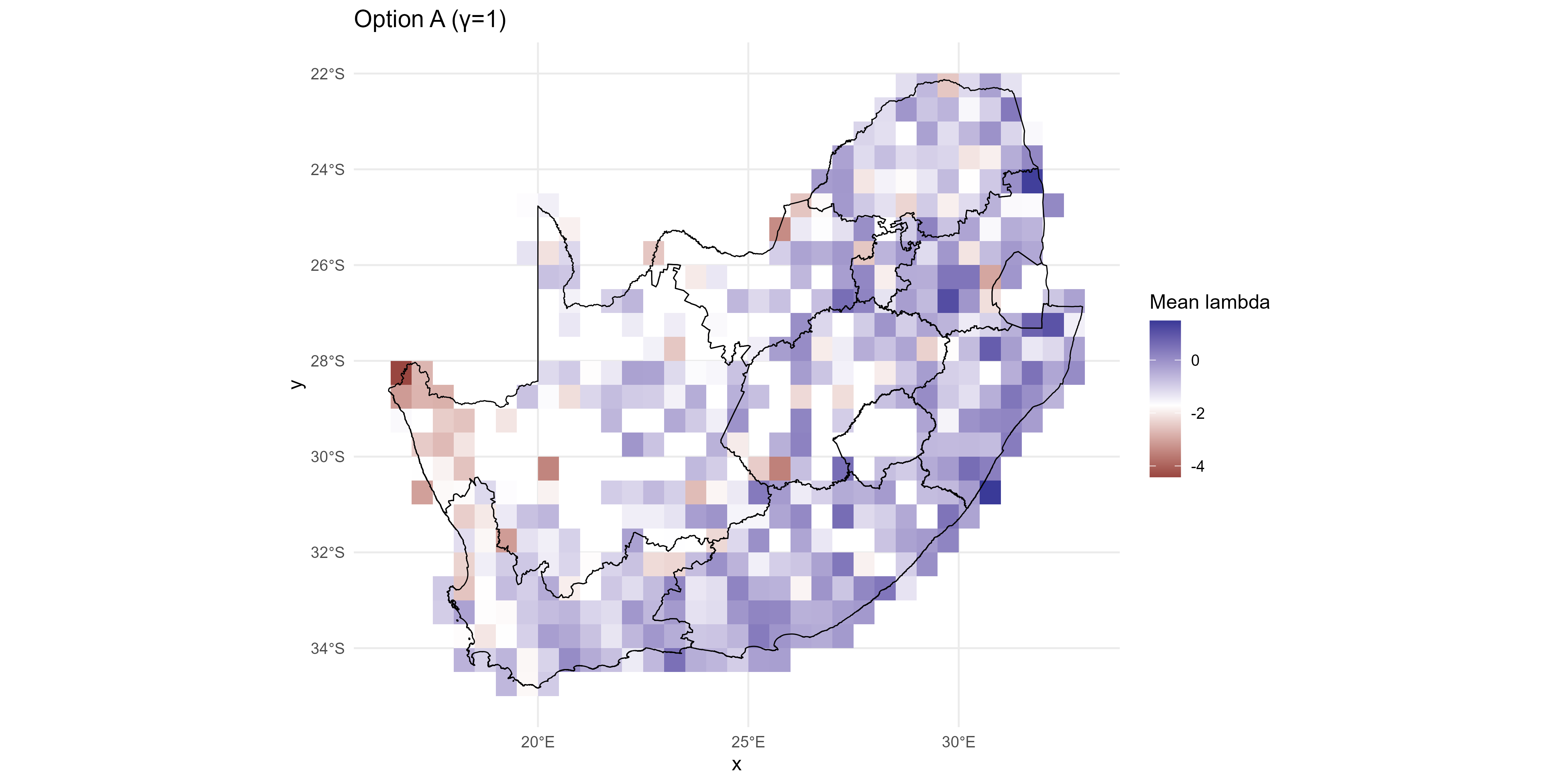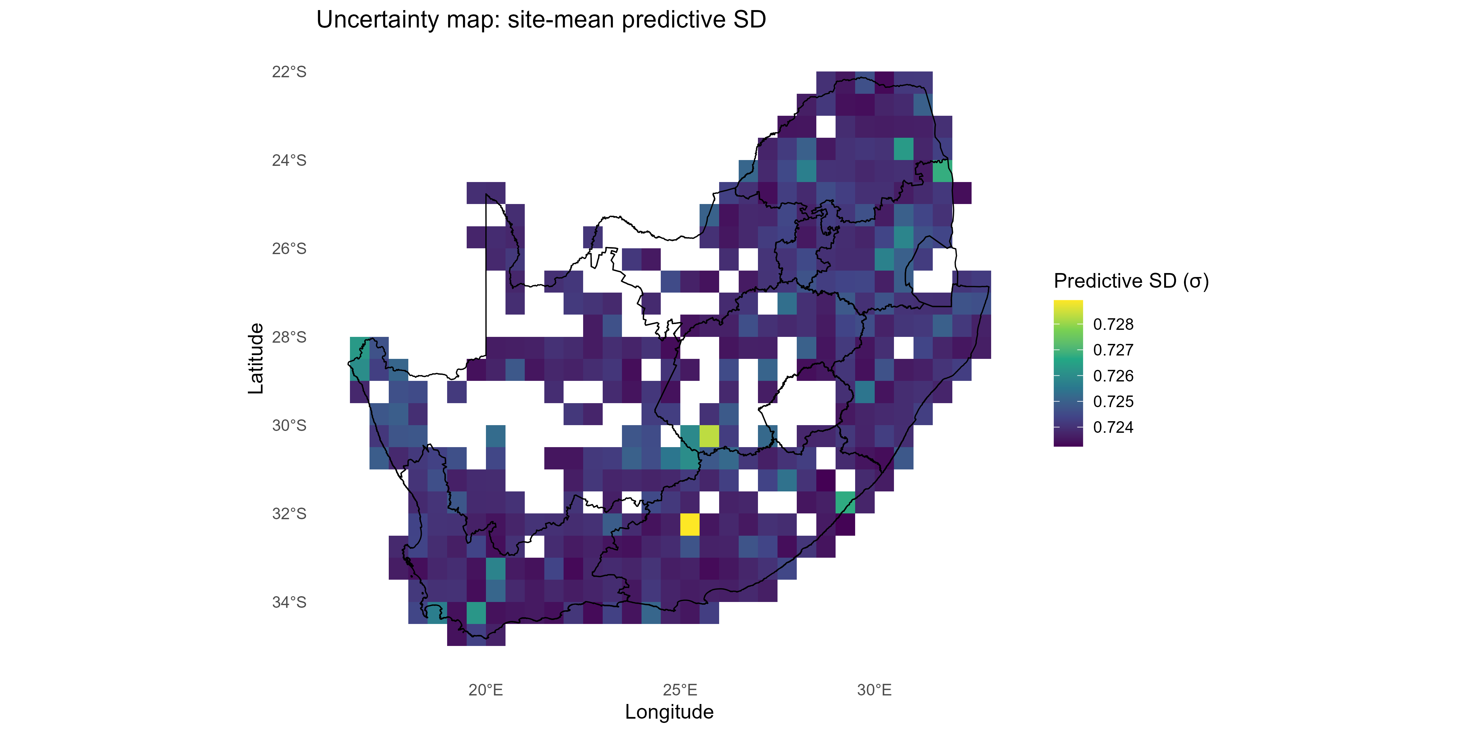 📈 Figure 10: Using a single, scalar \(\sigma\) converts \(\lambda\) to probabilities quickly, preserving relative patterns but without uncertainty adaptation. High or low \(\lambda\) regions stay extreme; consider the predictive-SD approach when you need risk that reflects confidence, not just the mean signal.