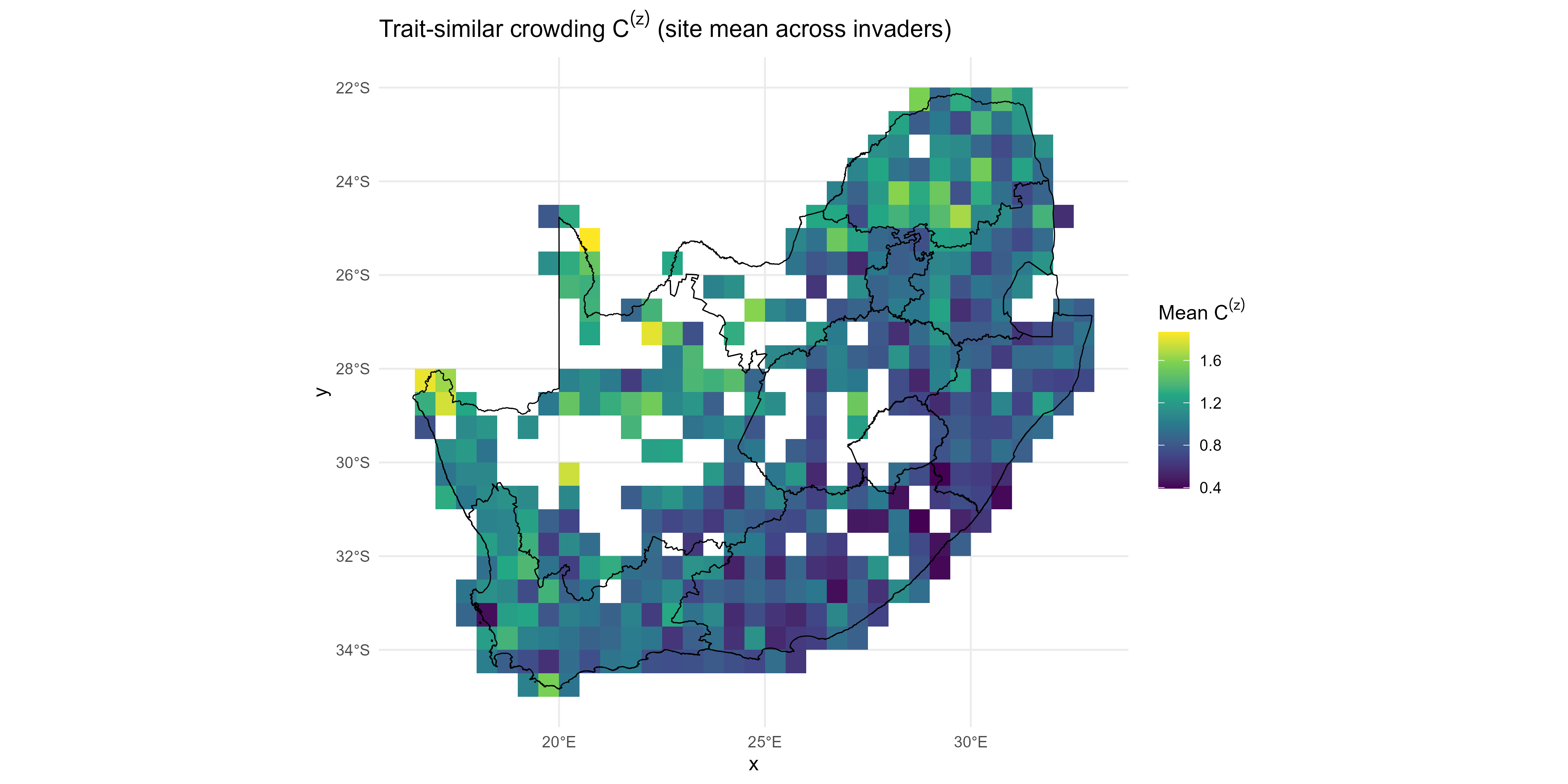 Here \(\gamma_i, \alpha_i, \beta_i\) are trait-dependent slopes, evaluated at invader traits \(t_i\), and \(r^{(z)}_{is}, C^{(z)}_{is}, S^{(z)}_{is}\) are site-invader predictors derived from resident data but conditioned on invader traits \(t_i\).
