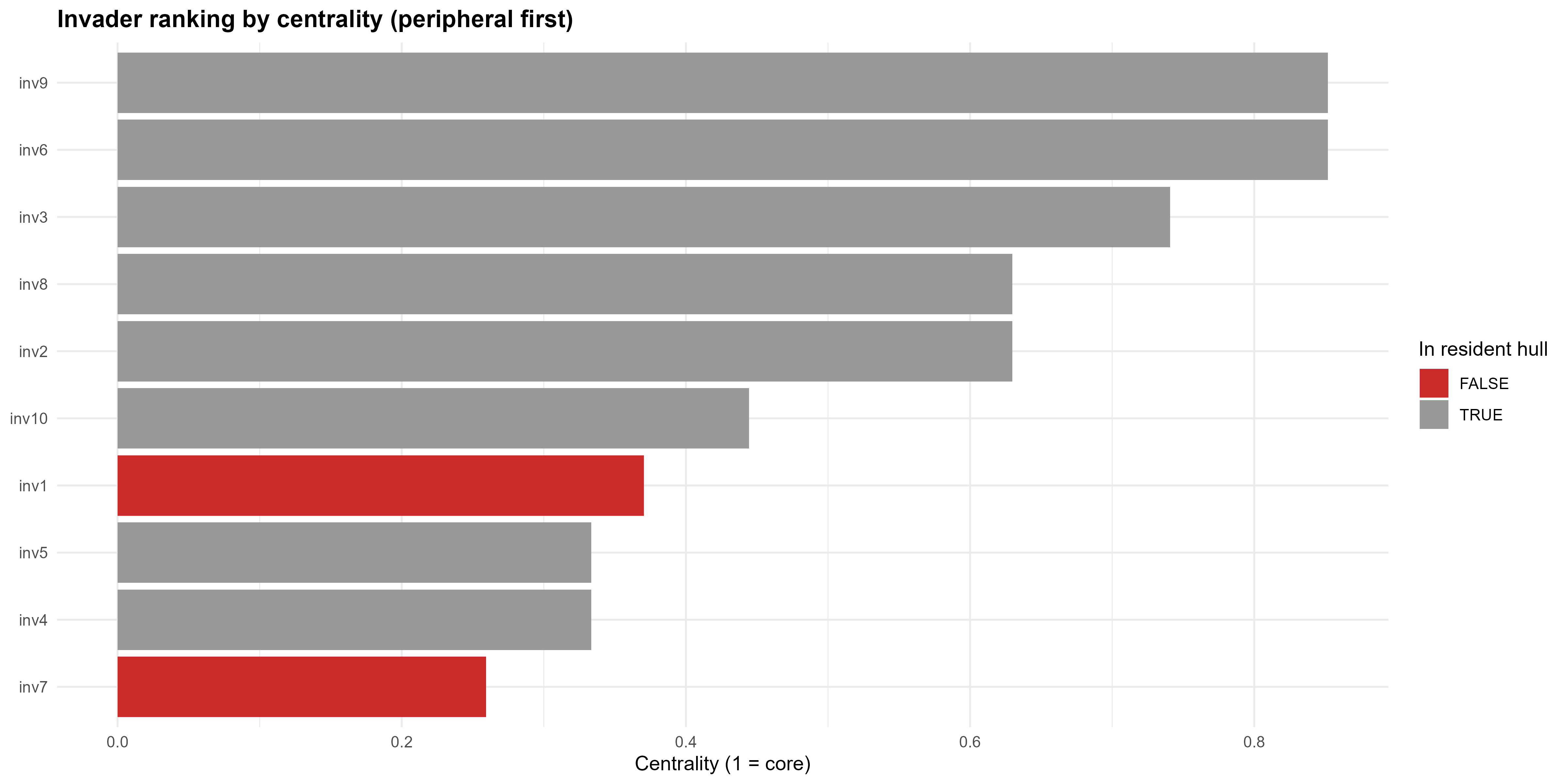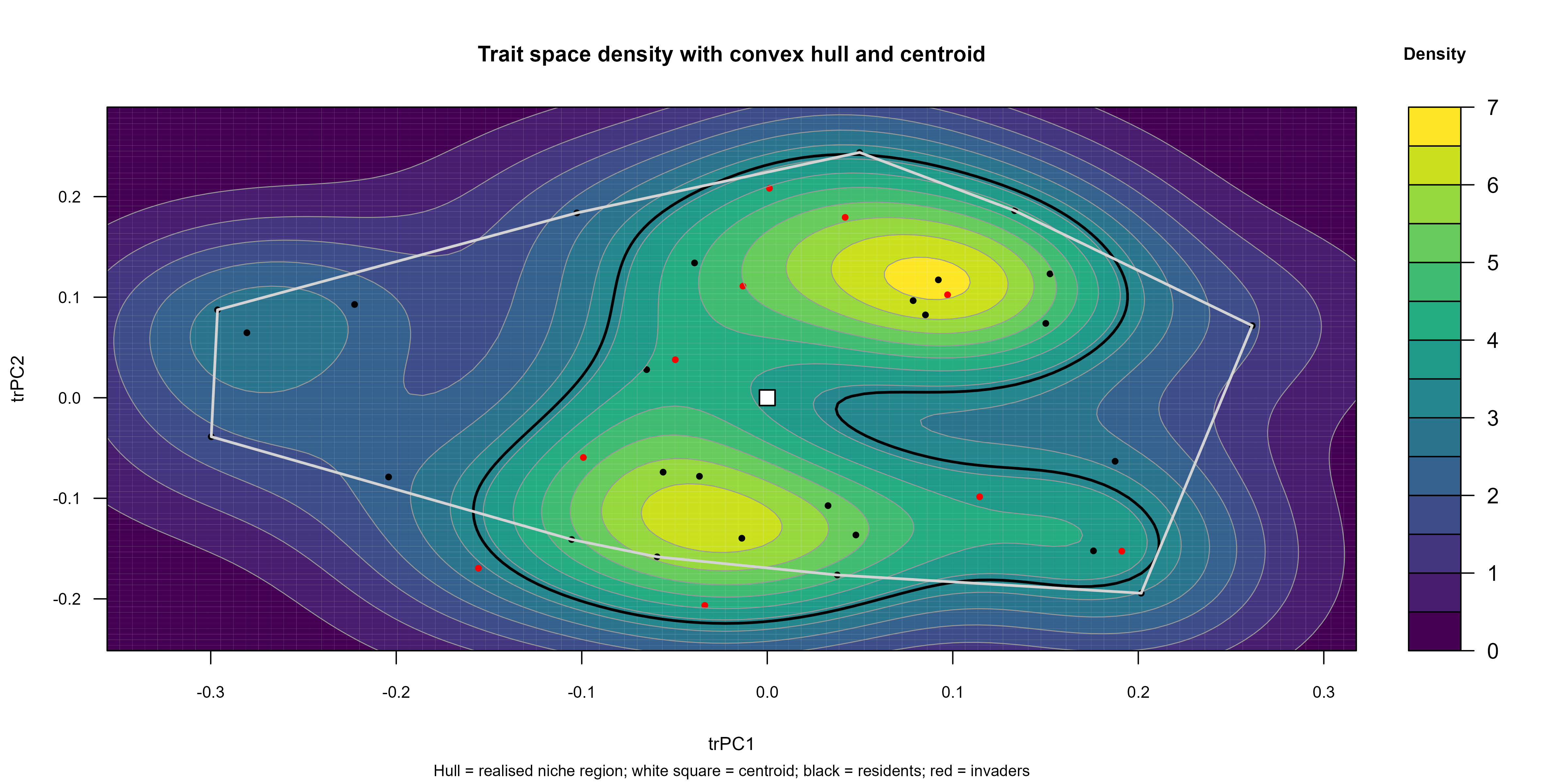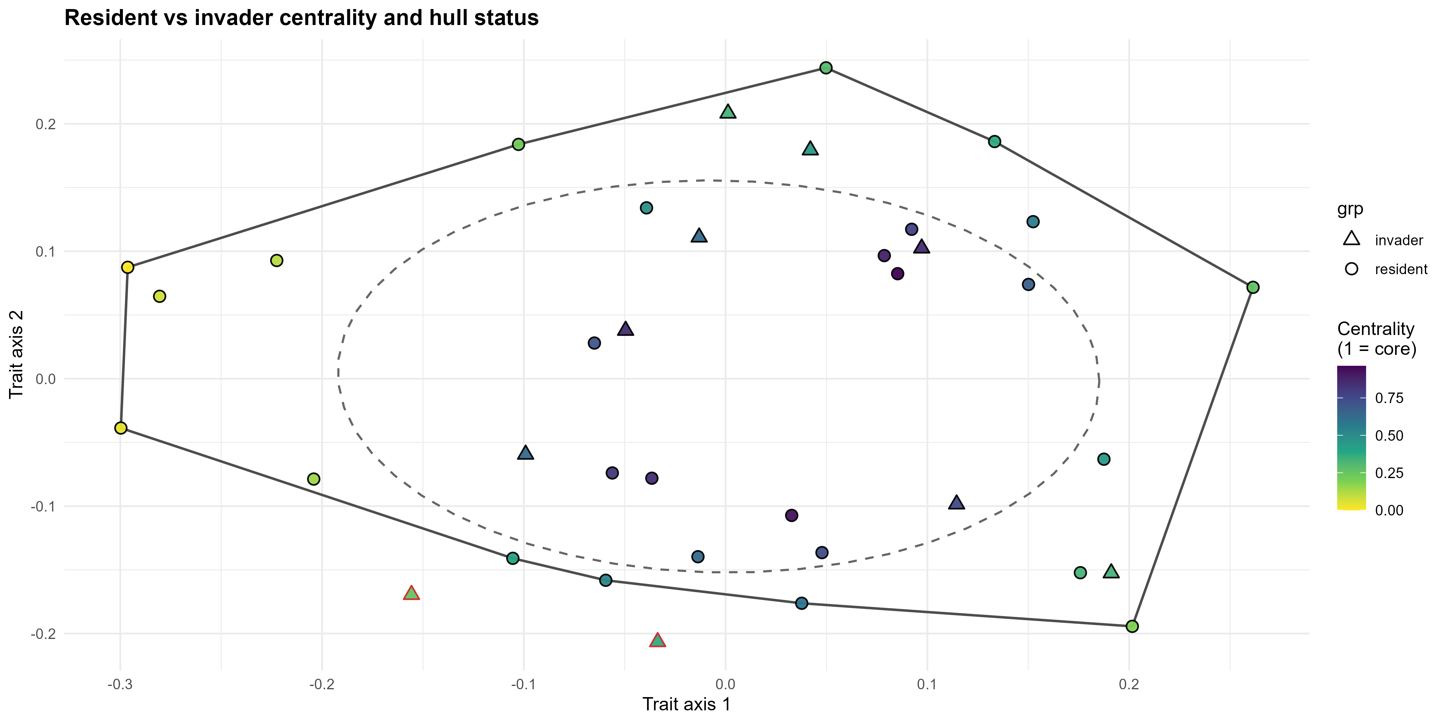 - Invasion fitness depends on an invader’s distance to the cloud centroid (trait centrality) and position relative to the hull.