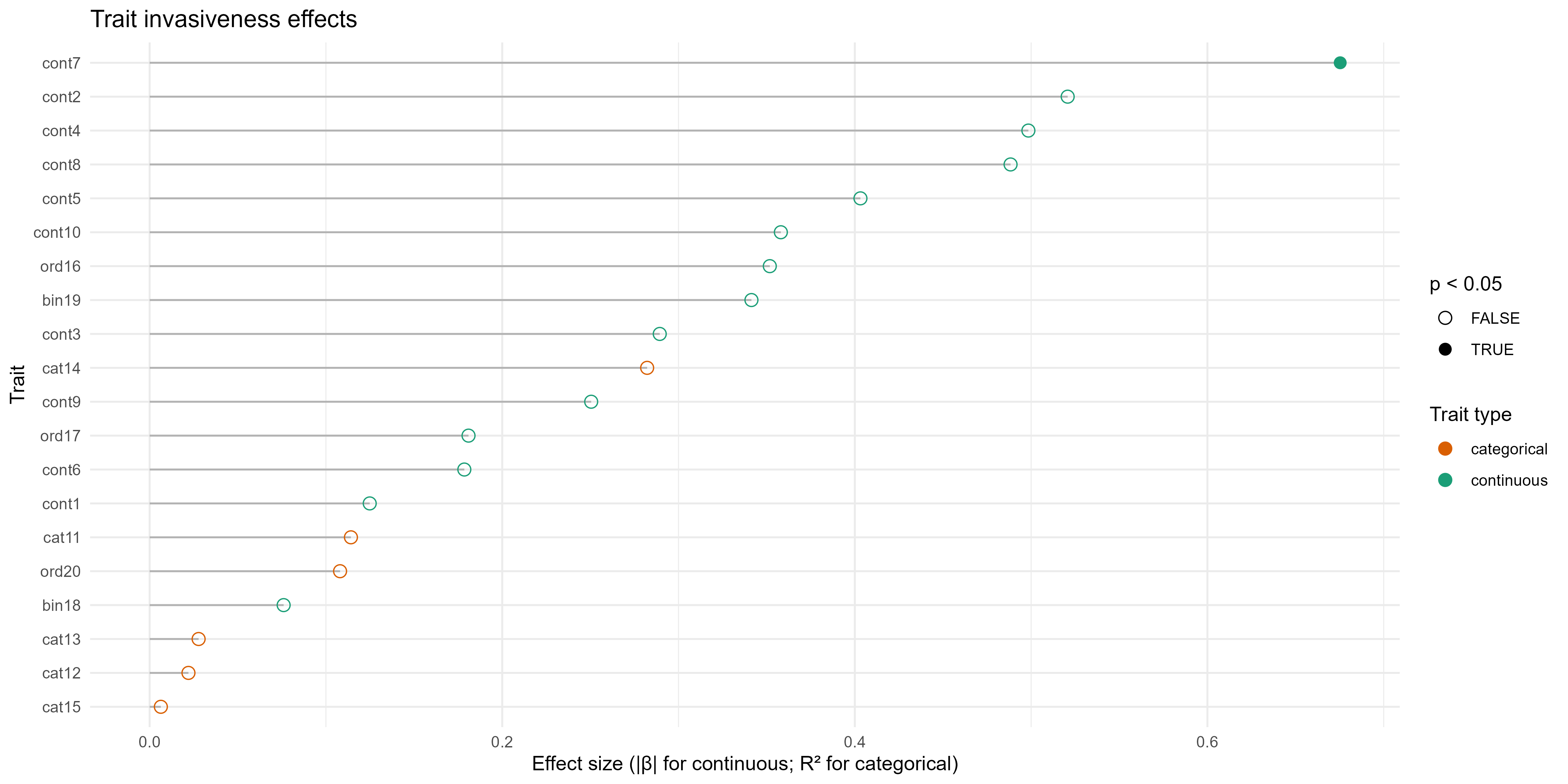 \[ \mathrm{TI}_k \;=\; \frac{\mathrm{Var}\!\left(\mathbb{E}[\,V_i \mid T_{ik}\,]\right)}{\mathrm{Var}(V_i)} \] where invasiveness is the fraction of variance in \(V_i\) explained by trait \(T_k\) alone (no other covariates).