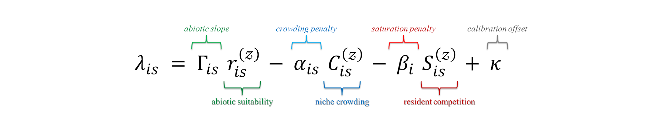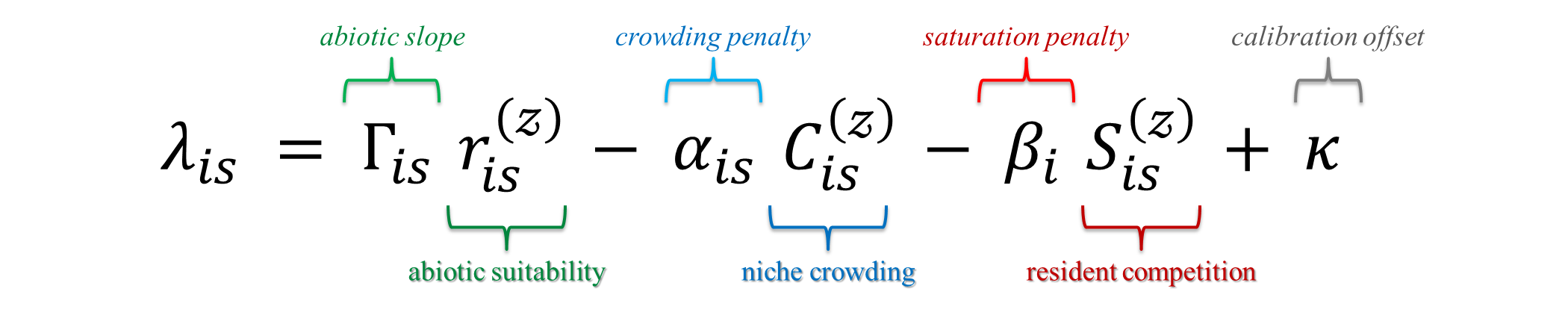\[ \boxed{\; \lambda_{is} \;=\; \underbrace{\gamma_i}_{\text{slope on suitability}} \;\;\underbrace{r^{(z)}_{is}}_{\text{trait-conditioned suitability}} \;-\; \underbrace{\alpha_i}_{\text{slope on crowding}} \;\;\underbrace{C^{(z)}_{is}}_{\text{trait-space crowding}} \;-\; \underbrace{\beta_i}_{\text{slope on filtering}} \;\;\underbrace{S^{(z)}_{is}}_{\text{performance-weighted filtering}} \;} \]