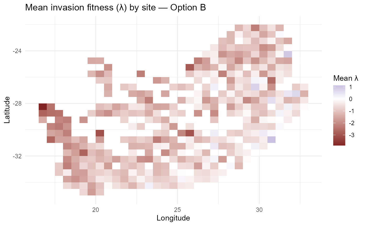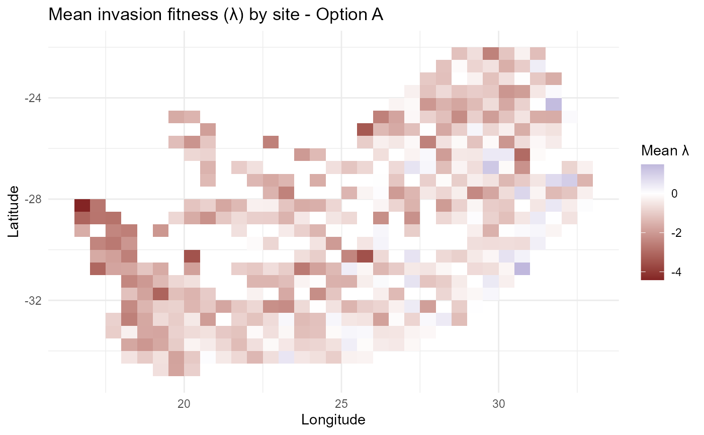 title = "Mean invasion fitness (\u03BB) by site - Option A", # or `expression("Mean invasion fitness (" * lambda * ") by site — Option A")`