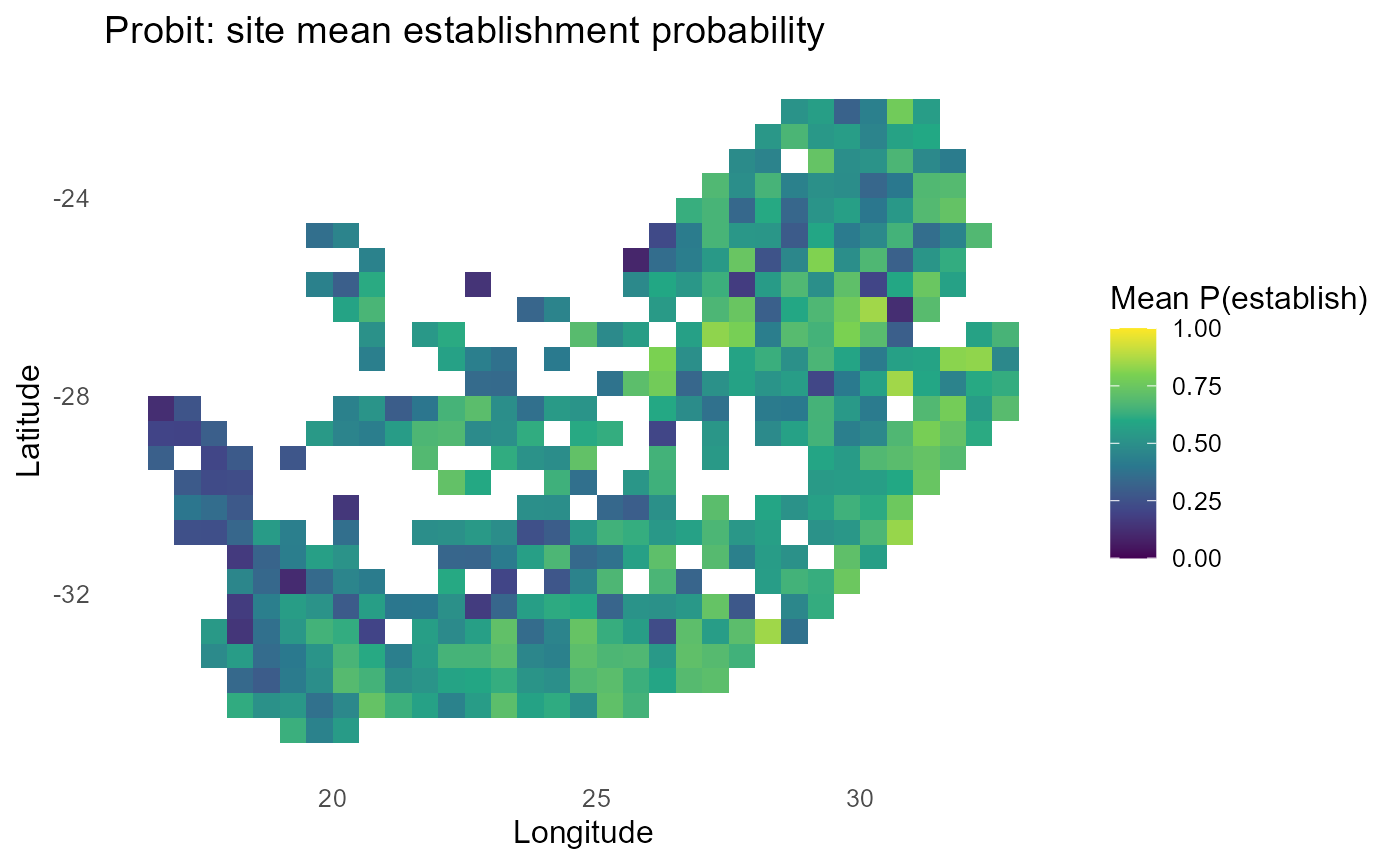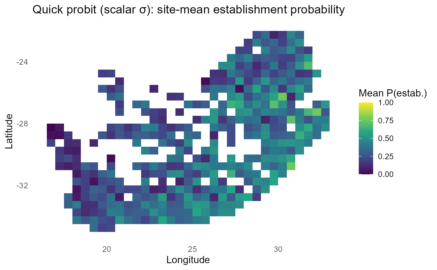 ggplot2::labs(title = "Quick probit (scalar σ): site-mean establishment probability",
