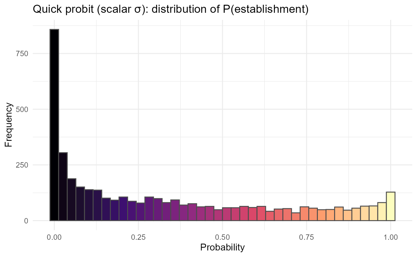 ggplot2::labs(title = "Quick probit (scalar σ): distribution of P(establishment)",