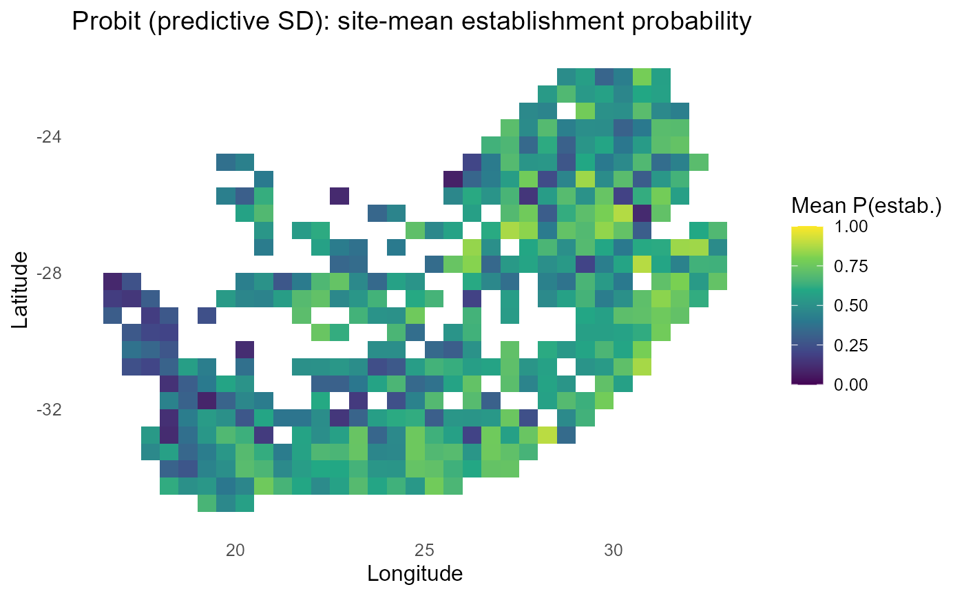 ggplot2::labs(title = "Probit (predictive SD): distribution of P(establishment)",