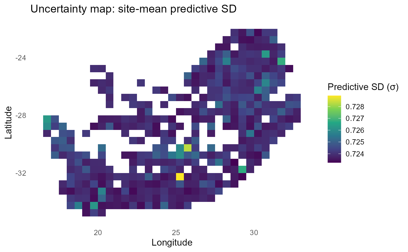 ggplot2::labs(title = "Uncertainty map: site-mean predictive SD",